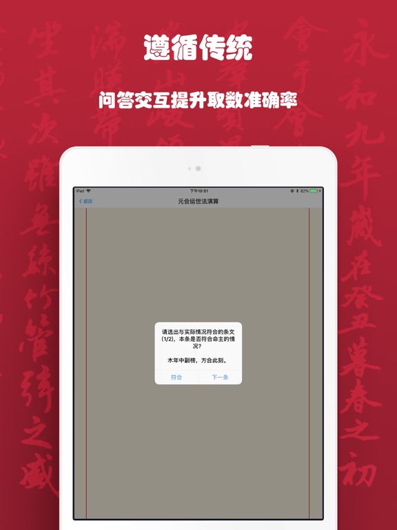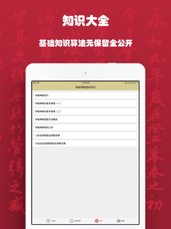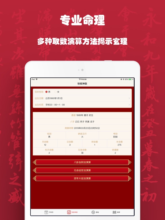 本应用: ⊙采用八卦加则、元会运世(皇极)、流年等三种取数方法 ⊙基于传统的12000铁板条文 ⊙内建老黄历择吉、万年历农历查询,今日宜忌、神煞方位、值日星神、时辰吉凶、九宫飞星、风水方位,一目了然! ⊙整理收录相关知识,方便学习,基础知识演算法无保留全公开! 铁版神数简介 铁版神数,坊间又作“铁板神数”,是一种根据“八字”,通过一系列复杂的推算法来预算命运的方法。铁版神数始于何时已无从稽考了,但它的兴起与流行者却是在清代乾隆、嘉庆年间,至令也有二百多年历史了。铁板神数历来被认为是最高境界的算命术,非七政四余、紫薇斗数、子平八字所能望其项背。相传铁板神数大师仅靠算盘拨算几下,便可尽泄天机,尤其是"六亲"生肖,一一道来,应验无误,其准确率令人咋舌称叹。倪匡先生对此推命术十分推崇,在卫斯里系列的《天书》《灵界》都有提到。 「铁板神数」所依据的,是一部宋朝邵康节先生留下来的著作《皇极经世》,几乎所有人的一生命运遭遇,全在这部书中。《皇极经世》一书是一部可与《周易》相媲美的巨著,目前广泛流传的《梅花易数》据说也是邵雍所作。邵雍师承李之才,李之才师承陈抟,陈抟在民间是一位神龙见首不见尾的传奇人物。 似乎比较多的人,都认为铁板神数跟四柱、奇门、六壬等一样,是一门虽以易经为基础,但基本上独立的一门预测学。而实际上,铁板神数绝非单独的一门术数,它的综合性是非常强的,要学好铁板神数,你必须先精通四柱、纳甲、紫薇斗数等,这是入门之基础,四柱、紫薇与常用的没什么两样,纳甲起命卦用的是陈希夷元堂卦式。然后,才可以配以铁板数的独特法诀。 铁板神数算命仅有四柱时辰是不够的,它还把每个时辰分为八刻,每刻又分为十五分,这就是让世人称叹的“考时考刻”。但这又是最容易让人误解的,因为这刻分并非时钟上的刻分,你即使把出生时辰精确到秒,也还可能是错的,这刻分用的是“卦气”。所以要用铁板神数算准一个人的命运,须此人当面考对刻分才行,刻分定准后,一生命运方能准确无误。-全新用户界面和体验 -增加万年历 -增加铁板神数相关知识 -增加流年取数法 -支持iPhoneXs Max