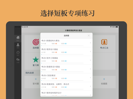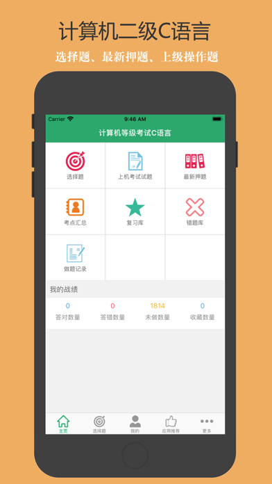 全国计算机等级考试二级C语言考试通关神器!选择题+上机操作题+最新押题+考点汇总,海量题库含解析,通关无忧! 每一道试题都有答案解析,为考试的提供了充分的复习准备,可随时随地学习练习,有效帮助顺利通过考试,学习知识通过考试必备神器! 【功能介绍】 1、选择题:按照考点分类的选择题习题,并有答案解析。 2、上级操作题:300道上机操作题,程序填空题、程序修改题、程序设计题。 3、最新押题:最新考试押题3套。 4、考点汇总:包含复习的考点。 5、错题库:可自动加练习过程中错题加入收藏,以便反复练习。 6、收藏夹:可在练习过程中自行收录题目到收藏夹,形成自己的小题库,针对性练习,提高通过率。 7、可通过题目关键字进行检索。 8、安装后可离线浏览,不用联网也可以浏览,速度快,无广告。 9、支持同时在iPad/iphone/itouch等多种设备中安装。 10、定期更新题库。新增试题和修复BUG。