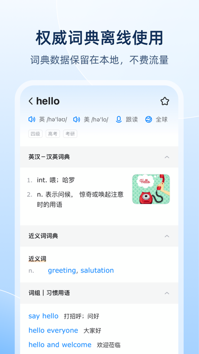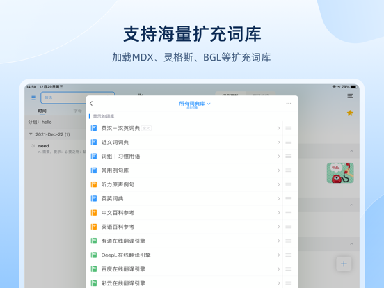 欧路词典是英语学习者的必备参考软件。启动快,功能全,无广告,免打扰;海量扩展词库,自定义编辑;支持中文、英语、日语、法语、德语等多语种翻译。语音翻译,拍照翻译,一键获取,操作便捷。 不仅能够查词、翻译、笔记、背单词,更引入了主题写作、批改纠错等AI功能,全方面改变你的英语学习。 【增强版和免费版区别】 增强版可以自定义发音库、支持在线同步、没有广告。 同时,为了避免用户再次复制词库,普通版支持通过软件内购直接升级。 【产品简介】 海量词汇:内置常用英汉词条30万个,专业词条40万个,海量例句库178万条。 AI翻译:摄像头取词、拍照查词功能,即拍即查,阅读文献好帮手。 单词复习:自定义学习目标,多种图表,帮你更好回顾自己的学习。 在线搜索:基于海量数据的云端词典,生僻词、例句、图片查询一网打尽。 纯正发音:美音、英音自由选择,自定发音语速、小语种发音应有尽有。 文件阅读:词典中即可阅读文件,支持单词长按查询,即点即译。 【强大词库】 权威词库:英汉 - 汉英词典、英英词典、同义词、反义词词典,权威详实。 编辑词库:提供电脑端词库编辑器,支持自制扩充词库;朗文、牛津,权威词库尽情添加。 扩充词库:通过网络下载各语种的扩充词库,支持Mdict、灵格斯、Babylon等多种词典格式,覆盖医学、经济、工程、计算机等十余个领域。 【实用工具】 高亮标记:重点词添加标记,批注内容支持录音和图片,云端同步,随时查阅。 笔记同步:生词本、笔记、历史记录功能,支持同步。 语音输入:英语整句翻译发音功能,支持语音输入。 文件传输:WiFi文件传输功能,无需数据线即可传词典或文章。 分屏功能:支持iPad分屏功能,一边浏览网页一边查词。 蓝牙键盘:完美支持蓝牙键盘,支持全键盘操作(iOS9以上用户可长按Command键查看可用快捷键)。 跨软件取词:集成系统Spotlight英语查词,使用其他软件时,长按即可查词。 【联系我们】 咨询邮箱 help@eudic.net【本次更新】 - 全新 阅读模块升级,Epub支持重点单词提示,段落翻译、样式布局切换、听书等功能 - 全新 阅读模块支持和其他设备同步高亮笔记 - 全新 阅读模块支持阅读统计和打卡功能 - 改进 针对iOS 26全新 Liquid Glass 设计进行优化 - 改进 部分词库加载样式优化 - 改进 2025秋季词库更新 - 改进 对话语音打分功能 【近期更新】 - 全新 词库在线同步、分享功能 - 全新 单词造句训练支持翻译模式 - 新增 跨软件翻译功能,实时翻译其他App中「复制」的内容 - 新增 生词本列表可以快速切换排序方式 - 新增 可以设置为系统默认翻译App