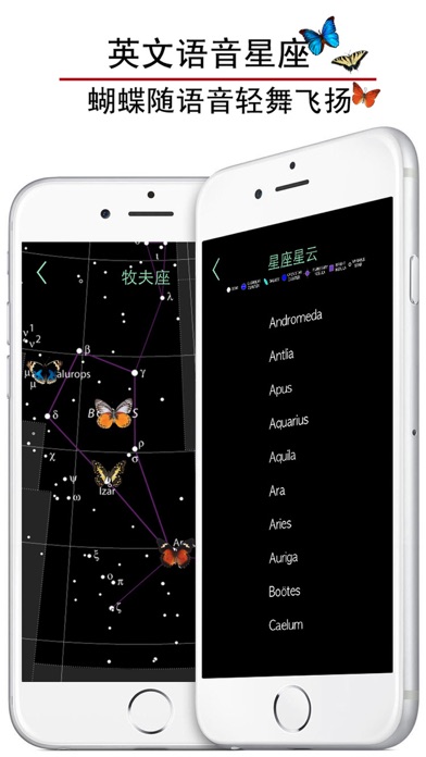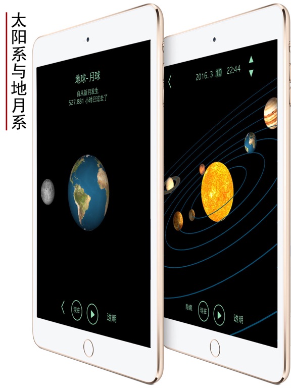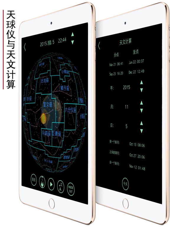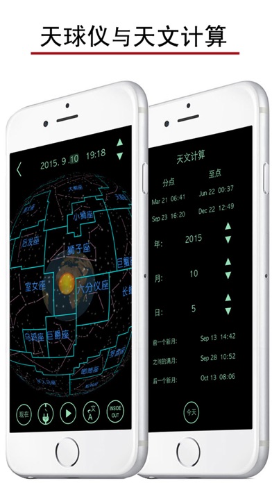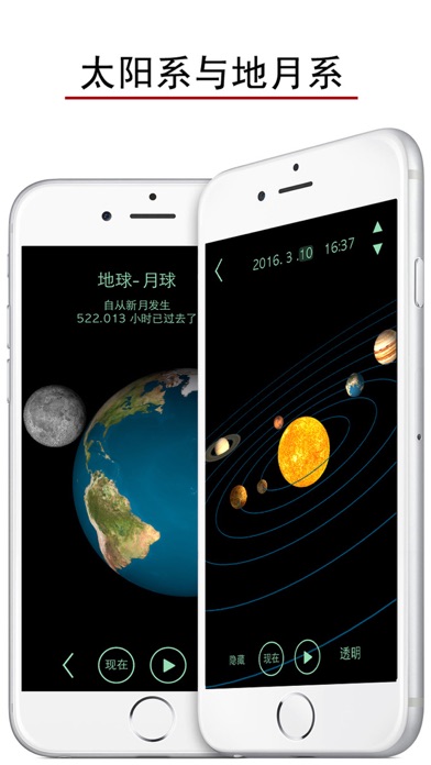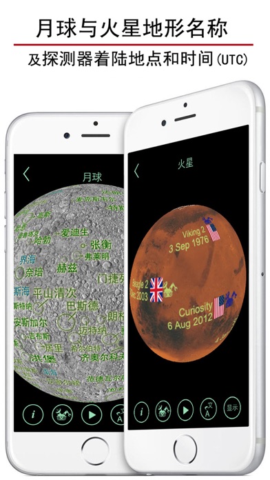 长夜漫漫,无心睡眠?很好,让我们一起数星星! 六合一:6大功能集合在1款App里! 太阳能系统和行星都是 3D! 特点: • 天球仪 • 行星仪 • 三维行星及参数 • 月亮与火星表面地图、环形山名称 • 登月着陆地点及日期(UTC) • 火星探测器着陆地点及日期(UTC) • 分点(春分、秋分)和至点(夏至、冬至)的计算 • 新月和满月的计算 • 地球月球相对运动演示 • 太阳系运动演示(任意时刻的行星位置) • 英文发音星座(一按蝴蝶就会翩翩起舞) • 白天的地球和夜晚的地球,世界各国的国旗 • 系统语言可以任意在App内切换: 英语 中文 俄语 日语 韩语 德语 法语 马来语 阿拉伯语 印度尼西亚语 详细信息: • 天球仪可以设置成“inside-out”,即镜像。 • 天球仪、环形山名称、火星地形名称提供多种语言: 英语 中文 俄语 日语 韩语 德语 法语 • 当您点击星座图中的一颗星星时,不仅可听到英文发音,同时可看见一只美丽的蝴蝶轻舞飞扬! • 在月球表面标注了嫦娥3号登月探测器“玉兔”的软着陆地点。同时,你可以看到苏联、美国的登月探测器在月球的着陆地点以及日期。 • 以中国人命名的环形山有:祖冲之环形山、石申环形山、张衡环形山、郭守敬环形山。 • 登月日期用的是UTC(世界调整时间),近似等于英国格林威治时间,即在北京时间减去8个小时。 月球上软着陆成功的国家只有:美国、 苏联和中国。Built with iOS SDK 18.