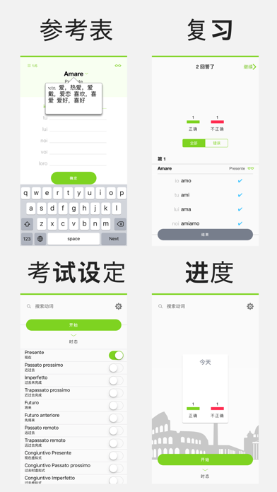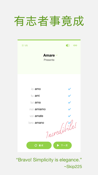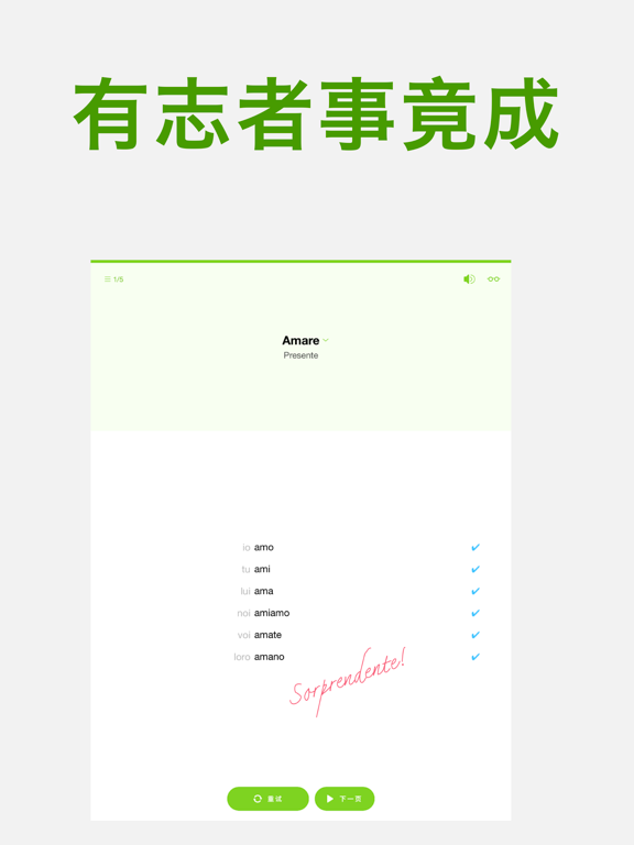 你想要能够说很流利的意大利文吗?你想不想要能够很自然的转化意大利文的动词呢? 这款App可以帮助你练习最常用的动词变化,让你短时间内成为一个意大利文高手! 功能 === • 由测验结果统计你最需要练习的动词跟时态 • 收录最常用的意大利文动词! • 意大利文-中文字典 • 不规则动词自动显示 • 计时测验及单词数设定 • 复习过去的答案 收录的动词 === Presente - 现在 Passato prossimo - 近过去 Imperfetto - 过去未完成 Trapassato prossimo - 近过去完成 Futuro - 将来 Futuro anteriore - 先将来 Passato remoto - 远过去 Trapassato remoto - 远过去完成 Congiuntivo Presente - 现在虚拟式 Congiuntivo Passato prossimo - 过去时虚拟式 Congiuntivo Imperfetto - 过去虚拟式 Congiuntivo Trapassato prossimo - 近过去完成虚拟式 Condizionale Presente - 现在条件式 Condizionale Passato - 过去条件式 感谢大家使用 Conjuu Italian。本次更新修复了动词「Assumere」显示为「Assumersi」的问题,并新增了「Mancare」、「Dividere」、「Ripetere」和「Salutare」等动词。