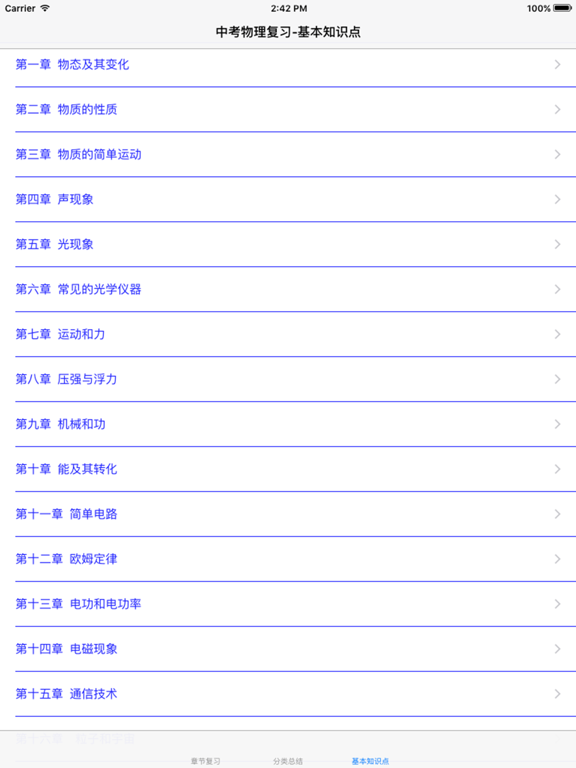 中学生物理学习的得力助手给力推荐~ 中考考前物理复习,内容涵盖了所有物理中考复习必备知识点、测试题大全: 第一章 物态及其变化 第二章 物质的性质 第三章 物质的简单运动 第四章 声现象 第五章 光现象 第六章 常见的光学仪器 第七章 运动和力 第八章 压强与浮力 第九章 机械和功 第十章 能及其转化 第十一章 简单电路 第十二章 欧姆定律 第十三章 电功和电功率 第十四章 电磁现象 第十五章 通信技术 第十六章 粒子和宇宙 初中物理公式大全支持iOS 18; 丰富更多内容;