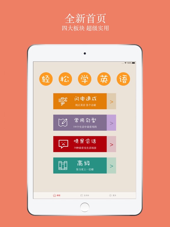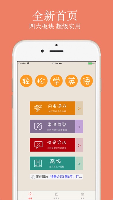 轻松学英语是一款好玩轻松高效的英语口语听力学习软件。 特色: 1.地道实用的英语对话,带动口语、单词、语法、听力、阅读等能力的全面提升。 2.课程内容覆盖日常会话、商务职场、旅游出行,校园生活等各类场景。 3.支持文本音频同步朗读、点读、随身听、单词查询。 轻松学英语让您轻轻松松学英语!-适配iPhone XS Max全面屏~ -内容学习界面全新改版,支持多种播放模式~ -新增英语学习内容,新增点读、单词查询、单词朗读功能~ -优化用户体验,使用更流畅~
