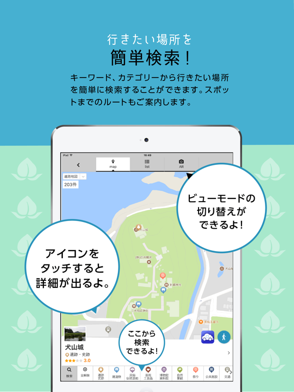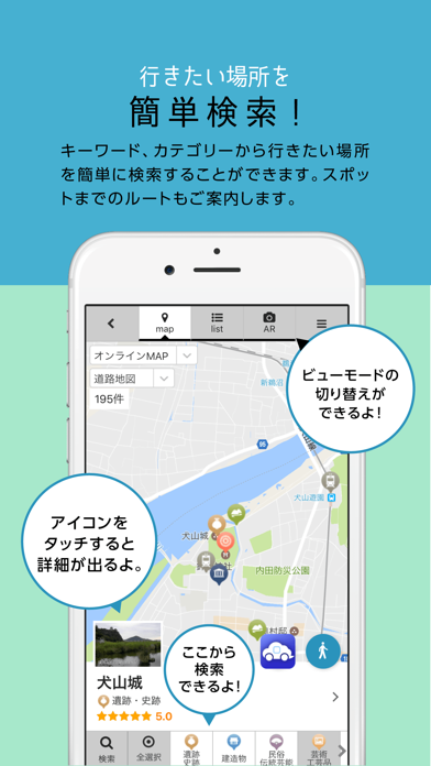 通过本应用,你可以了解犬山市的观光景点信息。犬山市拥有丰富的自然资源和众多的文化遗产。 有每主题介绍的「路线」功能、引导到达目的景点的「导航」功能。 使用离线地图,即使没有网路环境也能阅览地图。 到犬山市看看,发现它新的魅力! ● 与苹果的健康软件联动,显示当日的行走步数。(不支持iPad、iPad mini) ●利用NaviBridge(导航系统)的话,可以用智能手机向所定的汽车导航能发送定位信息。 有关“NaviBridge(导航系统)”的详细内容,请阅读其支持页面。 https://navicon.com/user/support/ *NaviBridge(导航系统)是电装株式会社的注册商标。 【注意事项】 GPS的工作性能方面,出现误差。 任务导航中,使用GPS功能以取得定位信息。 任务导航中,使用GPS功能以取得定位信息。 由于采用GPS功能获取定位信息比正常情况下,电池消费量要多,提请注意。 ・行进中操作手机非常危险。请站在安全的地方后再操作。 ・APP启动时会下载必要的数据。 为了避免产生高额的通信费用,请确认使用中的流量套餐 【推荐型号】 ● iOS 13以上 *仅限于内置GPS的机型 【应用软件的变更·中断·结束】 本应用软件,也有可能在没有事前通知顾客的情况下,变更运用方法,中断、终止提供服务。 在这种情况下,对变更·中断·中止行为,不承担一切责任。 【著作权】 本应用软件所刊载的各类信息,受著作权的保护。另外,也可以整体成为著作权的对象,而受到保护。除非有版权法认可,不得擅自复制·转用。此更新的内容如下。 ・修复了一些小错误 请继续使用该应用程序。