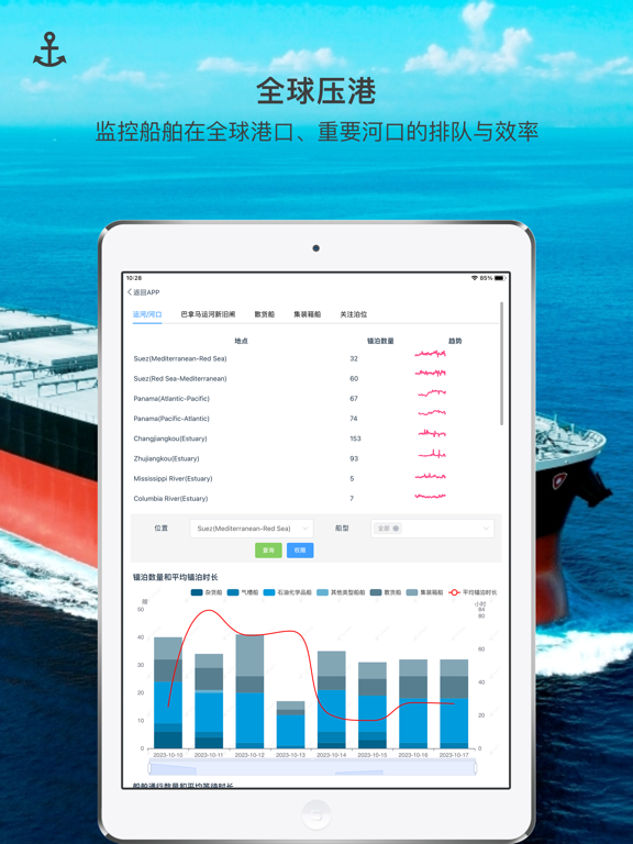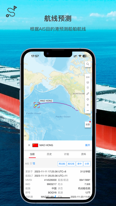 1.查询1百多万船舶目标的位置,每天1.5亿条船舶AIS报文会更新其中的18多万艘船舶的动态. 2.每周更新的全球海图 3.长达3个月的船舶轨迹回放 4.18万艘船舶的详细档案 5.根据AIS目的港预测船舶航线 6.航线规划、航迹推算和避台模拟 7.10天的海洋气象预报和气象导航模拟 8.航次速度分析 9.船队管理及预警,包括抵港、离港、恶劣天气、地震、走锚、停航、超速、旁靠、偏航、信号消失和恢复、航次信息变更等 10.根据船舶类型、载重吨、吃水等条件过滤船舶交通 11.关注自定义目的港,根据船舶类型、载重吨、吃水等条件过滤预抵船舶 12.设置电子围栏,并添加报警条件 【温馨提示】 强烈建议您在iOS 11.0以上的系统安装和运行本软件。 官方网站 https://www.hifleet.com/修复(显示-海区预报):地图显示