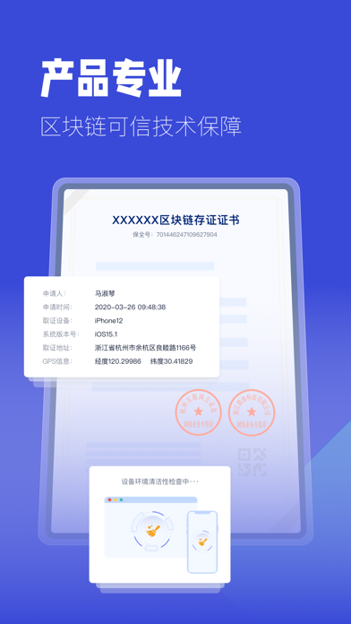 掌上取证拥有取证设备的清洁性检查能力,并通过区块链上链技术对取得的电子数据证据即时固定防止篡改,从而使得取得的电子证据具备司法有效性。 您可随时通过本软件进行拍照取证、录像取证、录音取证、录屏取证、网页取证等操作,从而客观记录事物状态、当事人行为、当事人言论、聊天记录、网页内容、软件内容等信息,并将其作为民商事纠纷中的电子数据证据使用,为您依法维护自身权益提供坚实的证据基础。 【产品功能】 确保证据合规,支持证据快速核验;提供技术保障,覆盖多种业务场景。 在掌上取证成功对您的电子数据文件进行区块链存证之后,您将会取得由保全网与杭州互联网公证处共同签发《电子数据区块链存证证书》,用于证明对应电子数据自存证成功起已经存在并且内容保持完整,未被篡改。 拍照取证 您可操作掌上取证软件,调用手机系统相机进行拍照取证,拍照取证所得照片将实时上链固证,并生成存证凭据。 录像取证 您可操作掌上取证软件,调用手机系统相机进行录像取证,录像取证所得的视频文件将实时上链固证,并生成存证凭据。 录音取证 您可操作掌上取证软件,调用手机系统的录音软件进行录音取证,录音取证所得的音频文件将实时上链固证,并生成存证凭据。 录屏取证 录屏取证将对手机屏幕所展示内容进行视频录制,您可操作掌上取证软件,使用录屏取证功能录制手机页面内容,如聊天记录、短信记录等信息,录屏取证所得的视频文件将实时上链固证,并生成存证凭据。 网页取证 网页取证针对无需登录操作的静态网页,对互联网公开内容截图取证,您可以通过输入网页URL地址获取网页静态截图,取证所得文件与操作日志将一同实时上链固证,并生成存证凭据。 【核心亮点】 门槛低 无需专业法律知识,覆盖多种取证场景,即时取得司法可信电子证据 判例多 多重信息安全保障,恪守证据认定标准,已公开各地各级法院判例1000余份 易验证 多端易用核验入口,详尽证据使用指南,随时随地核验证据真实性 【应用场景】 知识产权维权、消费者维权、现场取证、社交软件取证、诽谤造谣取证、工程施工取证、劳动纠纷、合同纠纷、婚姻家庭纠纷等。 微信服务号:保全网 官网:www.baoquan.com **有问题可联系我们** 咨询电话-85163779(工作日9:00-19:00) 我们将诚挚为您解惑,期待您的联系和反馈!已知问题修复,用户体验优化