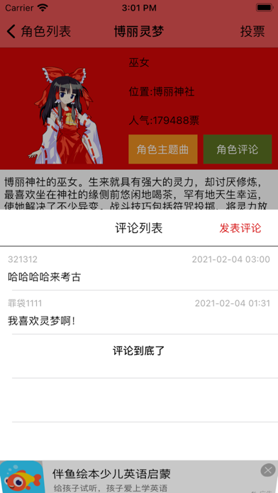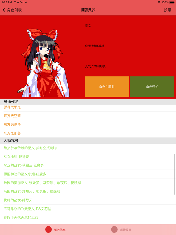 东方Project入门必备的知识大百科! 1.汇集了东方project100多人的详细资料! 2.汇集了ZUN大神的数十部作品的资料! 3.连黑历史的资料都有你造吗! 4.本软件持续更新,势要打造iPhone上最全最有用的东方百科! 5.如有意见和建议欢迎在留言中注明,作者是一个人不是一个团队,会虚心且耐心的听从各位的指导,让本软件越来越好! 6.或者直接到我的网站下面来砸我! http://www.xiaoluoli.com *友情提示:音乐均为网络链接,请注意手机流量!修复某些情况下无法评论和打开评论的问题