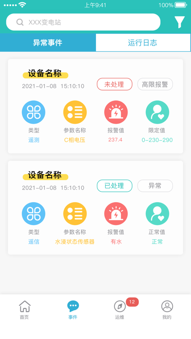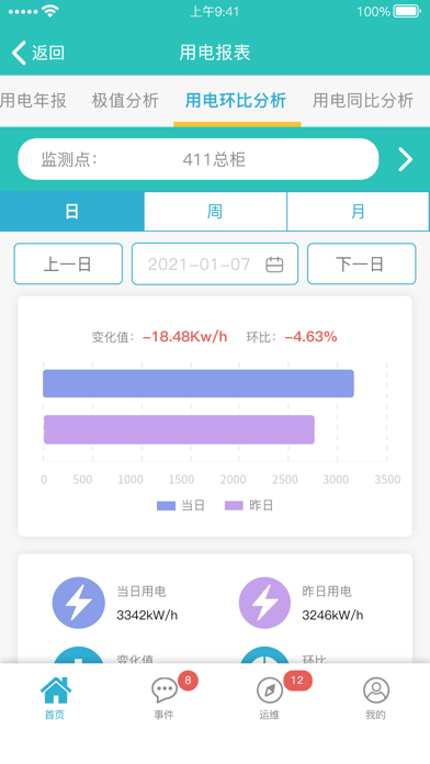电力运维平台App包含主页,事件,运维,我的,共四个主题页面。主要是对变电站的基础信息查看。主要包含用电量,功率,用电环比同比,报表等一些信息。运维包含对变电站的基础维保巡查的安全维护。我的页面是用户的基础信息。修复部分已知问题