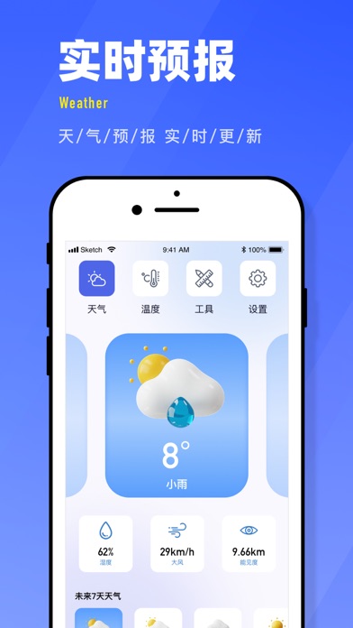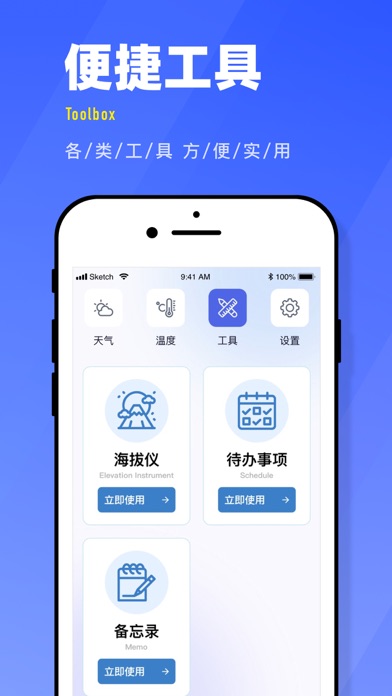 这是一款温度计应用,主要为用户提供实时温度数据,提供近期天气预报数据。 用户可以选择不同地区,应用将会自动提供选定的地区数据,实时更新天气和温度。 同时,应用还提供多款生活实用工具,海拔仪,备忘录等,助力美好生活。