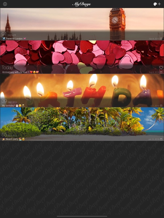 时尚,轻便的应用程序记住和在一个简单而快速跟踪你的活动! 查看剩余天数,或一个事件之后经过的天。你可以用它来提醒你:约会,纪念日,生日,节日,考试,活动节日...自定义自己的照片,或使用搜索功能,找到数以千计的免费图像上Pixabay!您也可以为每个单独的事件的警报。你可以选择一个喜欢的活动每次打开应用程序时要显示的! VIDEO PREVIEW: https://youtu.be/5hGuOXYthJs 产品特点: - 适用于iPhone,iPad和iPod touch上; - 选择活动形象,:相机,相册,Pixabay网上搜索; - 创建一个通知每个事件; - 你可以选择一个最喜欢的项目显示在启动时; - 事件前的剩余天数; - 在事件发生后经过的天; - 双击进入倒计时来改变颜色; - 将任何你想要的倒计时; - 所有事件的列表; - 分享社交网络(Facebook的,Twitter的...),或与您最喜爱的应用程序的情况下,保存,打印,复印,背景墙纸使用! 跟着我们: #bigdaysapp @bigdaysapp 您想改进应用程序还是将其翻译成您的语言? 通过应用程序的“信息”菜单与我们联系,由于您的支持,我们已将应用程序翻译成多种语言 :) 有关信息或建议,请在应用程序的信息菜单中的支持形式。 改进的动画; 添加了声音(您可以从应用程序设置中禁用它们); 我们祝你有很多BigDays!