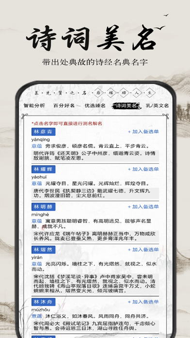 慕名阁品牌,诗经名典宝宝起名测名字,一款起名馆都在用的起名APP! 1、AI智能起名:定制化结合姓氏取诗词典故美名,好听优选臻名、赠乳名和英文名! 2、测名解名:含文化典故内涵、音韵读音、汉字笔画等十二维的综合姓名分析。 3、专家起名:国学老师结合诗经名典亲自来斟酌名字! 4、公司起名:结合经营行业、时尚风向来定制取名! 5、同生缘:找到与您同年同月同日同时出生的那个他(她)。 6、起网名,个性签名,专家讲堂等等更多免费功能!!! 慕名阁,您的选择值得肯定!--增加宝宝起名数据库,优化取名体验。