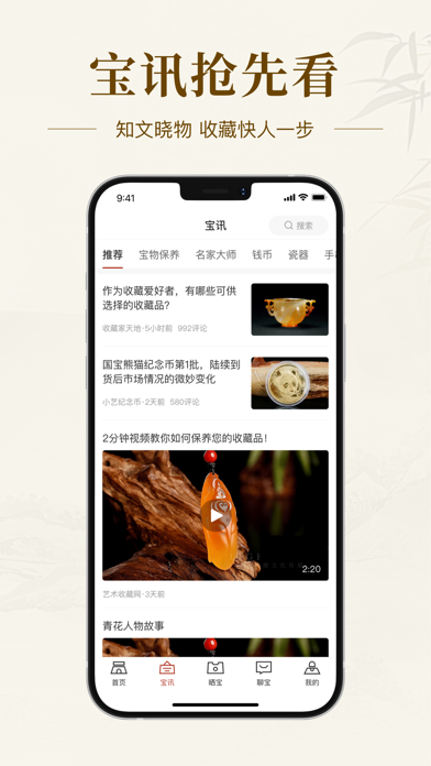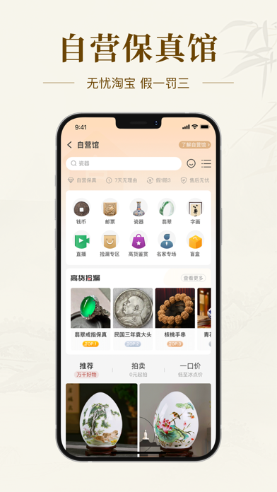 艺术收藏网,国内领先的文玩艺术品鉴定交流交易平台,集艺术品交流、鉴定、发布、买卖、分享于一体,聚集国内知名鉴赏专家和全国数千家艺术收藏专卖店及大批资深收藏大佬。 艺术收藏网采用一站式服务,线上线下结合,安全、透明、公正的交易原则,为解决藏友的收藏难,交易难,鉴定难,变现难,流通渠道少等痛点,为爱好收藏投资艺术品的藏友保驾护航。 【特色服务】 对于艺术收藏网上热卖的自营藏品,实施线上线下同步模式,藏友可以线上浏览,线下掌眼下单。 【覆盖范围】 集艺术品、文玩、工艺品以及世界非物质文化遗产作品的开发和推广,陶瓷、丝绸、玉器、国画、茶叶、名酒、名表、翡翠、书画,油画、碧玺、紫砂、玉石、文玩、翡翠、轻奢品、杂项等货真价实的奇珍异宝。 【功能介绍】 [鉴定]:权威专家 ,一元鉴宝 [好店]:海量藏品,多种选择 [拍卖]:0元起拍,低价夺宝 [直播]:在线看货,实时互动,行家把关,放心交易。 [视频购]:涨知识,开眼界、提高鉴赏能力的宝库 。 [藏友圈]:打造专属藏友交流圈。老物件集中区,捡漏“锦鲤池”修复了一些已知问题