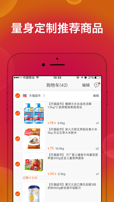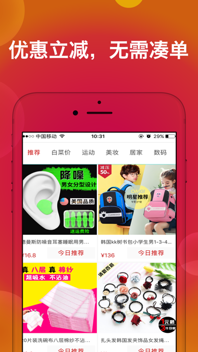 主流手机购物APP,APP里的商品都是当天必须买的,错过后悔一年,后悔一年!还有大量内部优惠券,大牌折扣,好货底价购,女装,运动、家居,母婴、家电、鞋包⋯⋯全品类覆盖,用心生活,精明消费。 天天使用《今日买什么》,生活质量将会得到极大的提高,我们想您所想,尽力服务,我们得到天猫淘宝的授权,可以用天猫淘宝账号直接登录,无障碍购物,方便快捷,也欢迎和淘宝、天猫、唯品会、蘑菇街、美丽说,什么值得买、1号店、当当、聚划算、聚美优品、口袋购物、楚楚街、卷皮9.9包邮、百度糯米、美团、大众点评、58同城、赶集网、去哪儿、携程、艺龙进行比较,帮您选购质量好价格优的商品。更多折扣,更好生活就在《今日买什么》! 5个栏目: 【推】推荐您今日最适合您的商品,拯救于您不知道该买什么的困惑之中. 【店】罗列您逛的店,从此不再迷途,不再问刚才我看到的宝贝是在哪家店的呀. 【劵】这个厉害了,天天都有超过300张内部优惠劵给抢抢抢,慢了就没了. 【车】同步天猫淘宝购物车,我们是有授权的喔! 【我】您关注的是什么,告诉我们,我们为您量身定制,做您的最爱 应用特色: 【独家特约】汇聚海量折扣精品 【折扣优惠】全场商品低至1折包邮,一块也包邮 【宝贝海选】专业选款师从海量宝贝中精选出值得购买并合乎您心意的宝贝 【精品砍价】资深议价师与商家唇枪舌剑,帮您直接砍到底价 【样品质检】商家信誉,资质,品牌授权,商品包装,细节,试用等全方位考核 【活动监督】实时监控商品价格,跟踪发货速度及售后服务 【联系我们】 《今日买什么》随时为您解决任何问题! QQ群:231901729 (今日买什么 支援群) 意见反馈:ibowandarrow@163.com 1.修复之前不能点击问题 2.优化体验