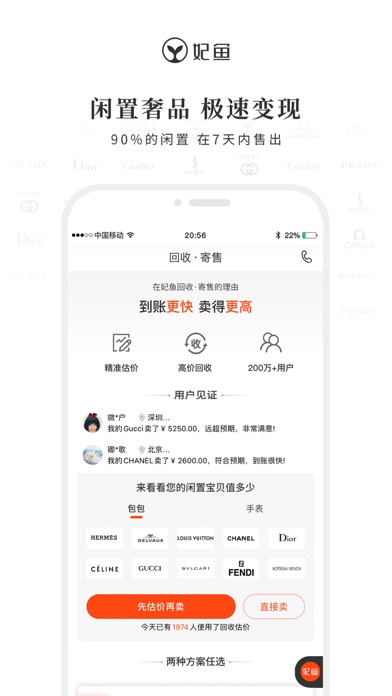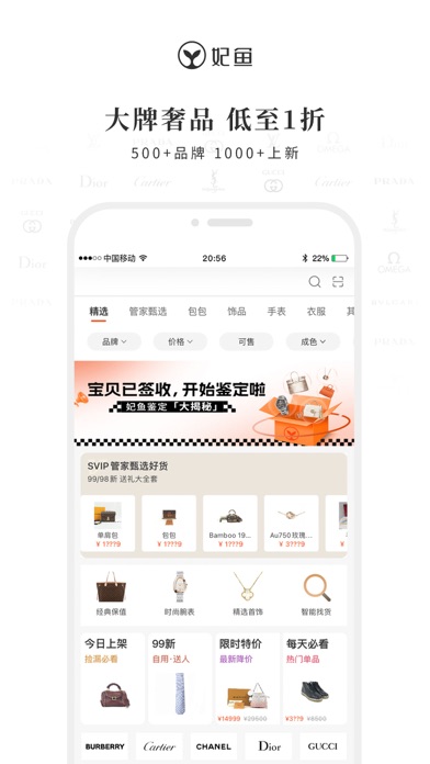 妃鱼是一个闲置奢侈品买卖平台,提供一站式寄售服务。致力于为高消费人群提供高性价比的奢侈品、珠宝首饰等时尚单品。 『1000+上新』每天1000+件商品上新,汇集LV、Chanel、GUCCI、卡地亚等大牌超低折扣 『100%正品』中检战略合作伙伴,每件商品均经中检认证鉴定师三重鉴定,正品保证 『极速售卖』90%的商品在15天内极速售出,科学的定价保证商品的售出速度和卖家收益 电话: 400-829-8688为提升用户服务和体验,我们对产品进行了更新,修复了已知问题,优化了应用性能,马上下载最新版妃鱼App,抢先体验最新的产品服务,感谢您对妃鱼App的支持。