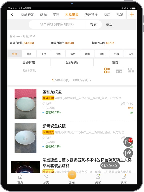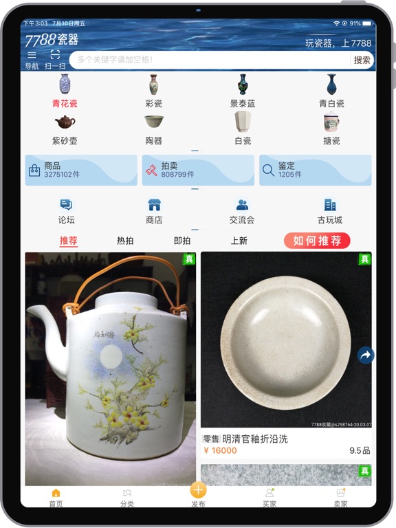 7788瓷器是专业的瓷器收藏、鉴定、投资、拍卖交易平台,主要提供专业的瓷器分类目录、权威专家鉴定、交流会和拍卖会信息、论坛交流以及多种交易模式等版块功能。 【经营范围】 1、瓷器/青花:瓷片、镶嵌瓷/瓷板画、瓷砖、雕塑瓷/瓷雕、青花瓷、彩绘瓷/彩瓷、单色白瓷、青白瓷/影青瓷、青瓷/秘色瓷、黑瓷/天目瓷、酱釉瓷/紫金釉、红釉瓷、蓝釉瓷、绿釉瓷、黄釉瓷、紫釉瓷、花釉/窑变瓷 2、陶器/紫砂:紫砂壶、其他紫砂、唐三彩、瓦当、古砖/画像砖、白陶、黑陶、红陶、灰陶、绿陶、彩陶、其他陶器 3、搪瓷/珐琅:景泰蓝/珐琅、搪瓷 【交易模式】 零售、批发、大众拍卖、快速拍卖、自由交易、约定订单等多种交易模式。 【网站特色】 1、商品种类丰富,八千万件商品供您选择。 2、近十万入驻活跃商家,百万买家在线交易的业内权威平台。 3、支持商品鉴定,权威专家团队把关,提供行业权威鉴定。 4、网站成立于1999年,在行业深耕二十余年,获得广大藏友的认可和信赖。 【APP功能】 1、商品上架实现快速连拍、多图同传的便捷功能; 2、在线交易信息的实时提示系统; 3、手机支付宝、手机微信支付功能; 4、分享到微信、朋友圈、QQ好友、QQ空间功能; 5、信息通知推送功能; 6、商品发布、商品买卖、订单商谈、商品搜索、好友交流等等主要功能。1、已知bug修复