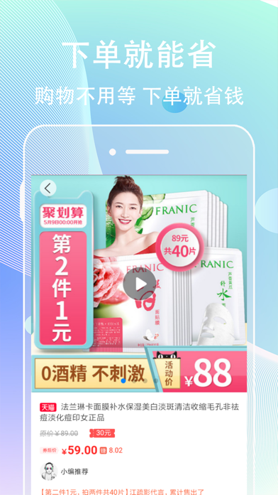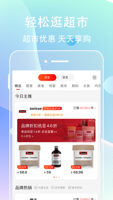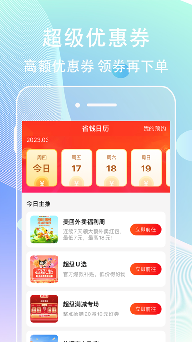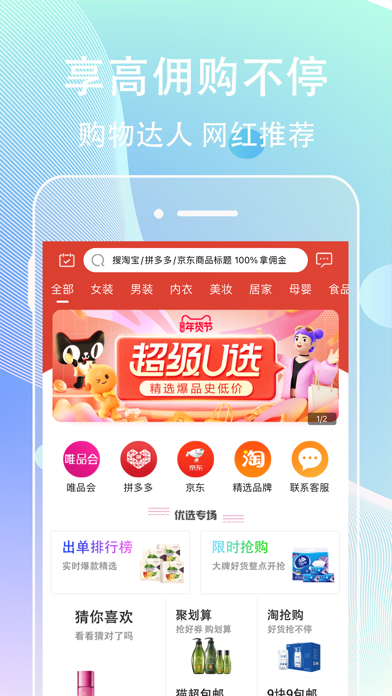 【应用功能】 自购省钱-领优惠券下单,同时还能获得高额返利 分享赚钱-分享优惠券给朋友,他们领券优惠下单,您获得高额推广佣金 集淘宝、天猫、京东、拼多多、唯品会、蘑菇街、当当、苏宁易购等各大平台优惠券 每日更新上百万优惠券,是学生党、上班族、宝妈、自由职业者的首选优惠券赚钱APP1.优化系统 2.更新部分功能