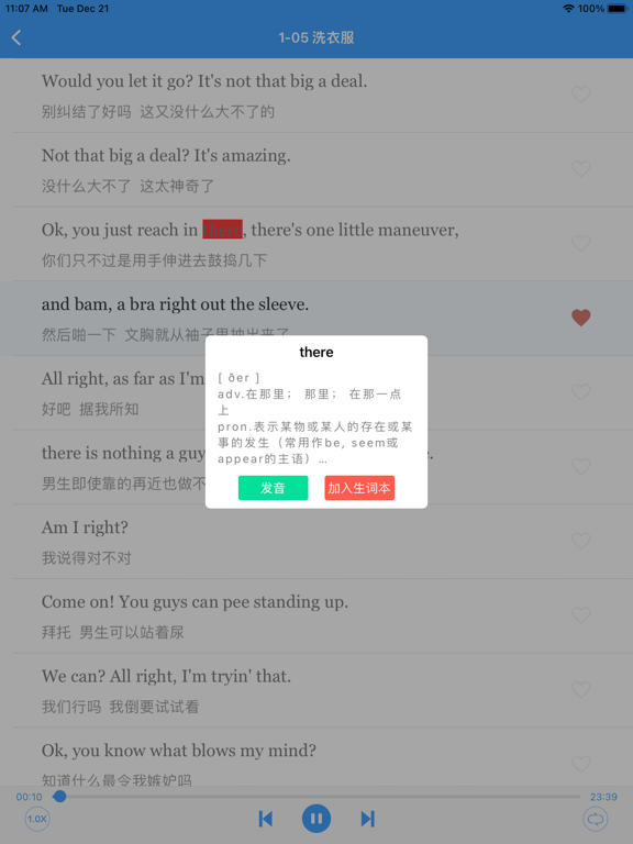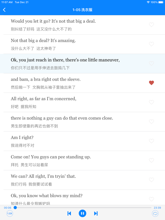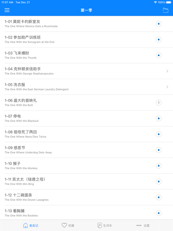 老友记-练习英语口语、学英语必备经典美剧!轻松幽默的故事场景,超级实用的口语练习,让你快速说出最纯正的美式口语。 【功能特色】 -中英语同步字幕精校,方便学习; -支持变速播放 -支持循环/单篇/单句循环模式切换 -支持单句收藏及播放功能 -支持滚动字幕,三种字幕模式自由切换 -支持文字大小自由调节 -长按即可查离线单词,可加入生词本 -锁屏字幕、锁屏控制、耳机线控全支持新增单词测验; 适配暗黑模式。