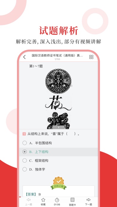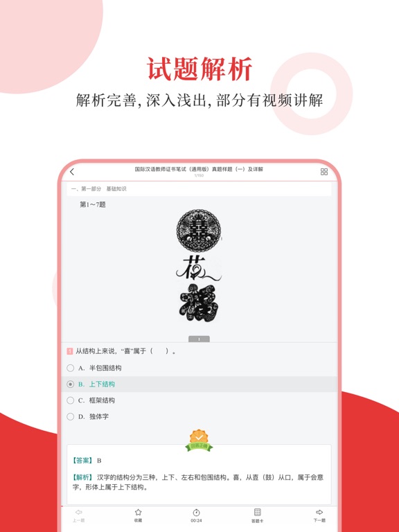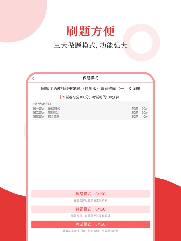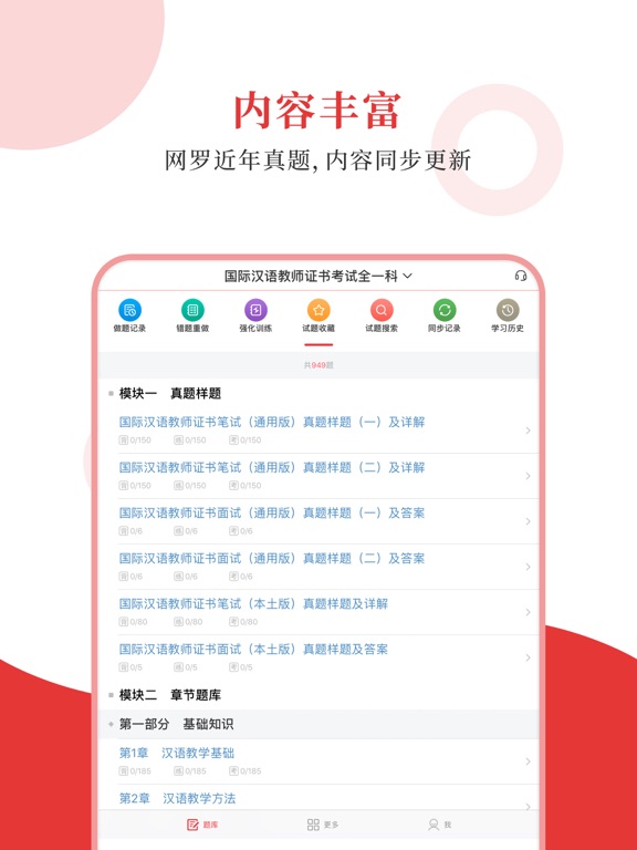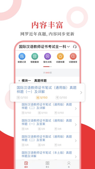 专为国际汉语教师证书考试精心准备的考试配套题库,每一道试题都有答案解析,为考试提供了充分的复习准备,可随时随地学习练习,支持手机、平板多端同时使用。 【内容】 国际汉语教师证书考试全一科 【圣题库介绍】 1.产品内容特点 ①更新及时,根据最新大纲或教材修订补充; ②题量大,多个刷题板块,历年真题、章节习题、模拟试题; ③考点全,部分有视频讲解重难点,随题观看; ④解析完善,深入浅出。 2.软件功能特点 ①三大做题模式,适应不同需要; ②详细做题记录,把握复习进度; ③关键词搜索试题,哪里不懂搜哪里; ④错题自动收录,好题手动收藏,查漏补缺; ⑤分析错题记录,个性化智能出题; ⑥AI 助手还能在你刷题过程中,针对错题进行详细分析,提供解题思路和相关知识点的拓展,助力你高效提升。1.随机抽题支持限定抽题范围 2.考试模式支持开启随机模式 3.修复了一些已知的问题