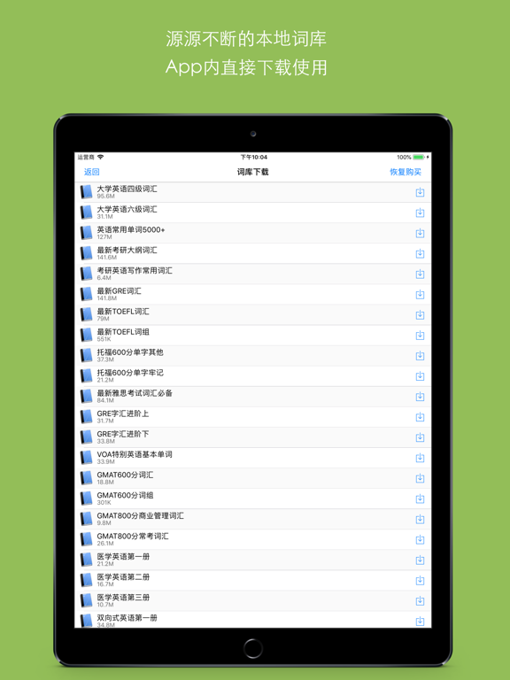 曾获荣誉:教育类中国区和澳门区排行榜第1名, 亚美尼亚区第3名, 香港区第5名, 台湾区第6名, 美国区第9名。中国区首页免费总榜进入前10, 单日内下载量火爆过万。 《单词我搜我记》(WordiSiR)是一款英语单词搜索查询与辅助记忆的软件。搜索我的生词, 自动生成我的复习计划, 根据艾宾浩斯遗忘曲线, 利用人脑记忆规律, 通过几个关键的记忆周期, 将我的生词变成我的长久记忆。搜一个记一个。 软件特点: 1、软件本身含有大量本地词库(含真人发音词库), 且在不断增加之中, 本地离线可查询常用单词、多种音标、真人发音音频、中英文释义、例句、等等。 2、在线查询则提供更多种数据来源(海词词典、金山词霸、有道词典等),更多种单词详细内容,海量网络资源可以源源不断的扩充您的词库。 3、TTS电脑发音功能,任何英语单词都能读出来,还能切换不同发音人物,改变音高、变调和速度。 4、查询保存的生词自动加入单词复习计划,自动生成复习提醒,搜一个记一个。 5、利用艾宾浩斯曲线进行科学的记忆,通过几个关键周期记忆,将我的生词变成我的长久记忆。 6、按照记忆规律和复习计划,只在该复习的日期进行待复习单词提醒,有效的复习不必耗费您大量的时间。 7、各种类型的单词测验将帮助您加深对单词的理解与记忆。错词复习功能更能帮助您纠正和加深记忆。 8、查一查单词可以分享给朋友;生成测验考题可以分享给朋友,考考小伙伴。 9、iPhone和iPad,大屏和小屏,横屏和竖屏,统统支持。 更多信息请到软件主页http://www.arwer.com了解。 △可供下载的部分本地词库: (1)《大学英语四级词汇》95.6MB (2)《大学英语六级词汇》31.1MB (3)《最新考研大纲词汇》141.6MB (4)《考研英语写作常用词汇》6.4MB (5)《英语常用单词5000+》127MB (6)《最新GRE词汇》141.7MB (7)《GRE字汇进阶上》31.7MB (8)《GRE字汇进阶下》33.8MB (9)《最新TOEFL词汇》79MB (10)《最新TOEFL词组》541KB (11)《托福600分单字牢记》21.2MB (12)《托福600分单字其他》37.3MB (13)《最新雅思考试词汇必备》84MB (14)《GMAT600分词汇》18.8MB (15)《GMAT600分词组》299KB (16)《GMAT800分常考词汇》26.1MB (17)《GMAT800分商业管理词汇》9.8MB (18)《大学英语自学教程上下册》86.9MB (19)《商务英语》53.3MB (20)《新概念英语第二册》22.3MB (21)《新概念英语第三册》37.9MB (22)《新概念英语第四册》37.7MB (23)《新概念英语第一册》16.7MB (24)《双向式英语第一册》34.8MB (25)《双向式英语第二册》21.2MB (26)《双向式英语第三册》12.8MB (27)《外贸英语一》43.2MB (28)《外贸英语二》41.9MB (29)《外贸英语三》45.6MB (30)《外贸英语四》44.6MB (31)《新编许国璋英语第一册》5.5MB (32)《新编许国璋英语第二册》7.8MB (33)《英语专业自考本专科上》72.8MB (34)《英语专业自考本专科下》67.9MB (35)《VOA特别英语基本单词》33.9MB (36)《计算机词汇》55.5MB (37)《高中英语第一次必修》17MB (38)《高中英语第二次必修》10.2MB (39)《高中英语第三次必修》8.5MB ...新词库持续制作中... 更多词库可以从App内直接下载。 新版本正在持续开发中,大家提到的建议和意见我们都看到了,在您的支持下我们会越做越好的,请继续关注我们,谢谢。1、适配新系统,提高兼容和稳定性。 2、解决在线查词使用金山词霸查询无结果的问题。 3、其它一些改进和优化。