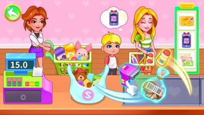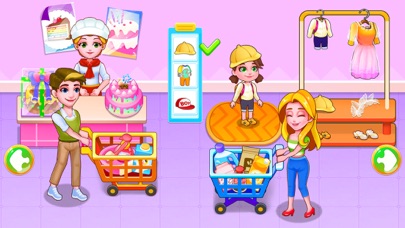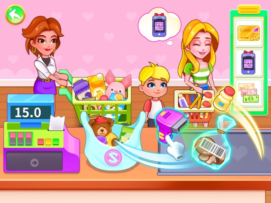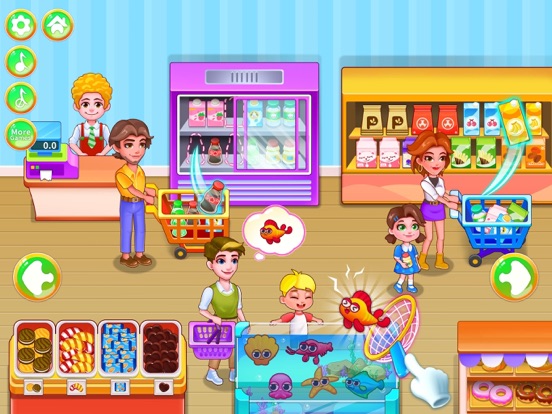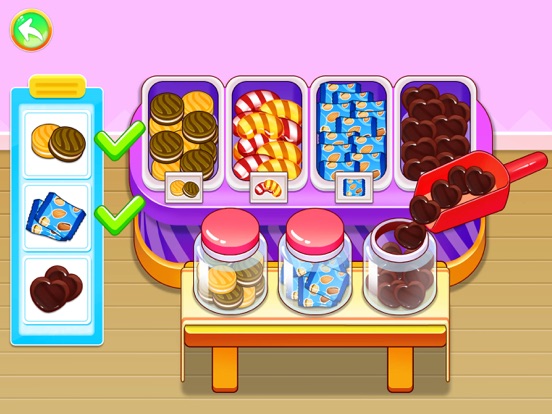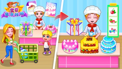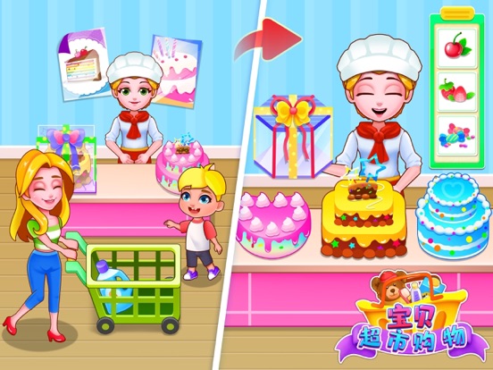 宝宝们可以按照超市的分区来选购。 真实还原线下超市,设置十几个个商品柜台:食品区、生鲜区、服装区、玩具区......各种商品应有尽有。巧克力,坚果,饼干被放在同一个货架上,它们都是零食类,宝宝们记住了吗? 宝宝在购物的过程就能学会物品分类品类,认知商品的名称、颜色等内容。 动手体验做饭 宝宝还可以体验制作蛋糕,学习烹饪方法。先选择一款蛋糕胚,是黑巧克力蛋糕还是美味冰淇淋蛋糕?然后用可口的奶油裱花,完美!蛋糕就完成了啦! 换装装扮 给自己换上一身新的衣服吧,挑选合适的服装,鞋子,给自己好好打扮一下。 还可以为超市进行装饰。 修理小达人 化身修理小达人,修理破坏的物品柜台,打扫清洁清理柜台,让超市商场看起来非常的干净。 结账付款 购物流程全体验,散装的水果蔬菜要进行称重、贴上标签和打包……购物步骤一个不落。蔬菜2元,蛋糕8元,“2+8=?”算一算,要付给超市多少钱呢?!