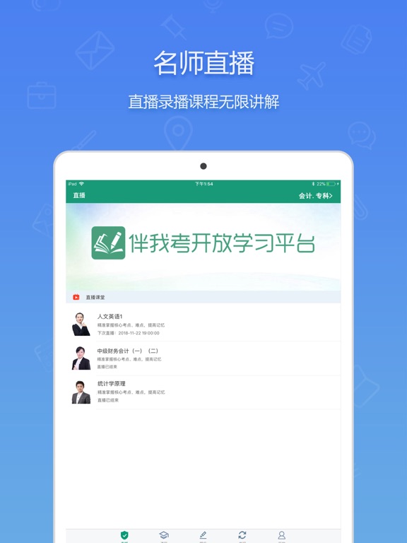 伴我考开放学APP可以帮助学生随时随地学习,最大化利用时间,提供报考流程和资讯、名师视频课件、直播互动授课、在线模考和练题等功能,涵盖大学专、本科行政管理、工商管理、会计学、商务英语、学前教育等全部专业。 【题库】全面收录教师资格证优质题目,包含章节练习、模拟题库、历年真题,题目配有详细解析,帮助考生理解知识点。 【视频】教师支持视频由主流命题专家主讲,为考生免费提供重难点知识点的讲解。 【直播】直播课程由名师在线讲解,考生可以随时随地与老师互动交流,真正做到有疑问当场提出,当场解答。修复若干bugs,优化用户使用体验
