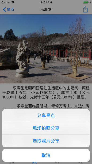 基于卫星数据和实地反复勘测绘制的景区地图,准确标注了全部景点位置和景区道路,支持GPS定位。游客可随时查看自己当前位置和周边景点道路情况,不用担心错过重要景点或走弯路。提供景区内全部近100个景点的详细介绍。提供交通、就餐、游览线路、游船等各种相关实用信息,方便游客制定合理游览计划。 提供景区精准离线地图和定位功能: - 按真实地理位置和比例关系绘制的高清晰度景区离线地图,支持单手控制的智能缩放。 - 支持GPS定位,精度在10米以内。用户可随时开启或关闭定位功能,降低iPhone的功耗。 - 定位功能开启时,可按距离从近到远的顺序显示景点列表,方便用户查看周边景点情况。 支持多种方式显示景点信息: - 提供颐和园景区全部近100个景点的详细介绍,包括许多未开放和未恢复的景点。 - 用户可以在地图中直接查看景点介绍,也可以通过列表方式查看景点。 - 列表方式支持按区域、按拼音和按距离查看景点介绍。 - 通过列表方式查看景点时,地图可自动显示景点对应位置,方便用户查找。 提供景区完整游览信息说明: - 提供景区开放时间、门票价格、交通方式、周边餐饮、游览线路、游船服务等完整的说明信息。 - 以文字、图片、地图等多种直观方式展示给用户。 - 方便游客制定便捷、合理的游览计划,获得最佳的旅行体验。 应用内购买: - 景区内定位功能和按距离查看周边景点信息为收费功能。 - 其他介绍和功能,用户可以直接免费下载应用查看和使用。1. 支持 iOS 13 深色模式 2. 优化相关显示界面