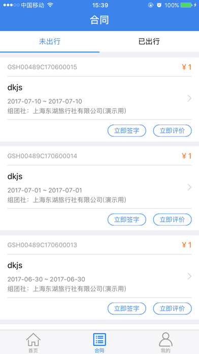 手机号动态登录或密码登录;登录显示该手机号的所有合同推送消息列表;查看合同列表,查看合同详情,包括个人信息、协议条款、行程单等;设置签名;指纹签字;对本次行程做出评价,查看评价内容;二维码扫描查看合同详情。功能优化.