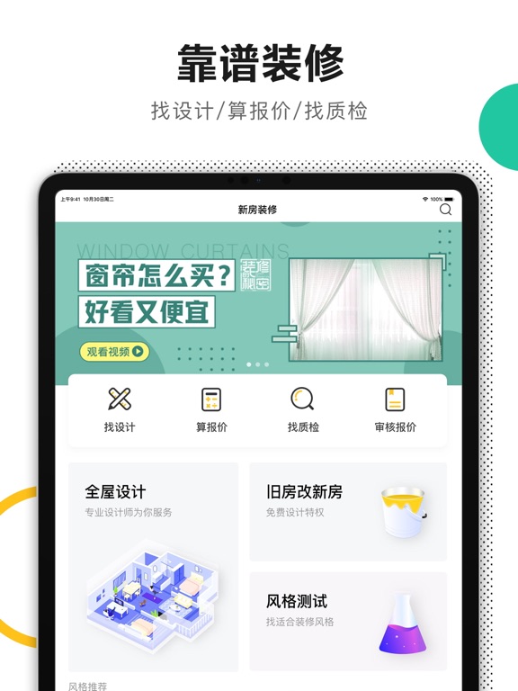 有新房要装修就上《新房装修》 服务全面的装修网站,汇聚全国11万多家正规装修公司,为用户提供透明、省心、省钱的一站式装修服务。 用《新房装修》,平均立省30%装修预算,教你实实在在握住自己的钱包~ 【功能亮点】 1.【装修美图】10万多张高清装修实景图,激荡更耀眼的装修灵感。各种户型、风格,只有想不到,没有找不到。 2.【装修公司】汇聚全国11万多家正规装修公司,专享免费户型设计;在土巴兔找装修公司比其他渠道便宜20%,满意后再付款。 3.【装修攻略】防陷阱、省钱省心,1小时了解家庭装修时不可不知的细节和常识;精选日记,业主真实装修历程,教你装修不走弯路。 4.【装修服务】专业监理质检、满意后付装修款、快速维权,全程帮你严把装修质量关,不用再为不懂装修而苦恼。 关于装修,一切你想要的,尽在《新房装修》~ 我们还在不断的改进,请提出你的建议,方便我们改善服务,让装修行业变的更加阳光透明。优化产品体验,修复部分已知问题。