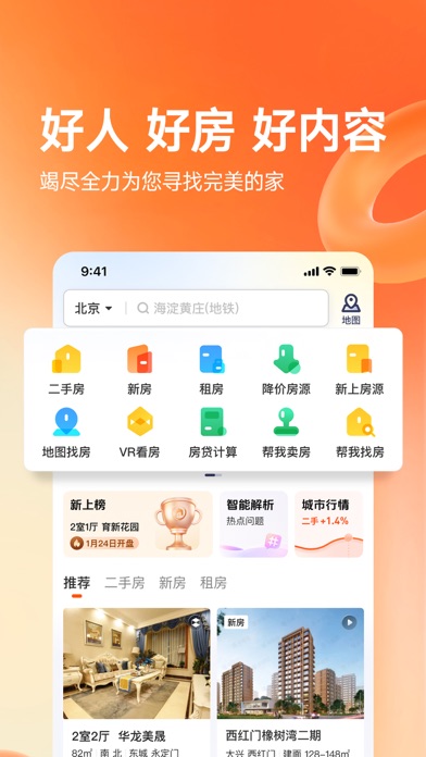 · 找二手房新房租房,买卖房产查房价VR看房房屋估价的专业房产应用 · 小区业主真实点评,从用户角度真实反馈小区楼盘信息和居住环境 · 大咖说房,用专业的视角指导用户怎样在楼市中挑选适合自己的房产 · 大平台房源全,覆盖多类型房源信息,让你省心挑好房 · 产品优势 【海量房源】二手房,新房,租房,海量房源任你选 【VR看房】身临其境的看房体验,线上看房高效方便。 【房贷计算】实时利率调整,做到多模式下房贷金额心中有数。 【购房百科】最新的购房从政策到过户全流程信息指导。 【地图找房】支持多维度定向找房,让你的找房便捷高效。 【新上房源】随时随地获取上线房源信息,好房源快人一步。解决已知问题,提升APP使用体验。
