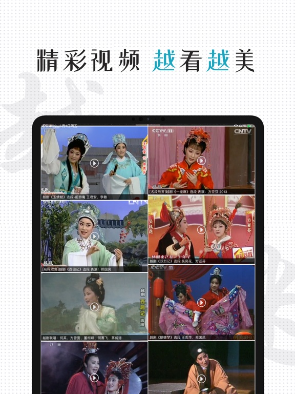 「越剧迷」是一款专业越剧App,包含经典唱段、视频、美图、伴奏、资讯等内容,提供观赏、分享、交流、展示、戏装变脸等功能,为越剧爱好者打造一个全面深入欣赏越剧戏曲艺术的平台。 (1)越剧名家经典唱段音乐,配以精美图片和描述和唱词,可以离线下载欣赏,一键设置成手机铃声,分享给微信好友、微信群、朋友圈与大家一起欣赏。 (2)精选越剧演出视频,综艺节目,名家名段及全本大戏,教学视频,戏曲艺术家即兴表演,戏迷表演等。 (3)海量高清越剧美图,越剧电影电视舞台剧剧照,艺术写真照,演员生活照等。点赞模式为自己喜爱的越剧偶像加油助力,与更多人一起欣赏爱豆美照。 (4)精选越剧伴奏免费下载,经典越剧独唱、对唱伴奏、唱词,一键跳转原唱方便学唱。对于稀缺伴奏,还可发帖求助其他戏迷。 优化越剧迷精选伴奏功能 优化越剧迷百科功能 优化程序运行效率