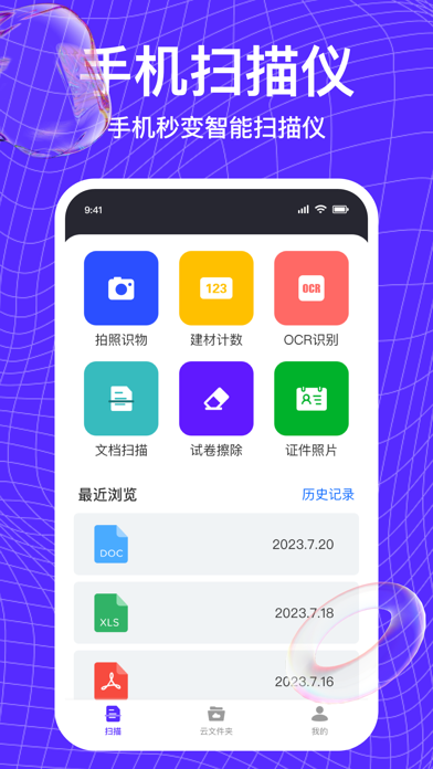 【应用介绍】 万能扫描王,做一个"万能"的手机扫描"王" 【功能介绍】 手机测距 使用手机摄像头进行点到点的距离测量 拍照识物: 拍摄动物、汽车、植物、品牌LOGO、货币、红酒、蔬果、菜品、地标等物品,一键识别物品名称 OCR文字识别: 拍摄文字,根据文字语言识别文字内容,支持中、英、法等多国语言 试卷擦除: 拍摄写有答案的试卷或内容,一键擦除已有答案得到空白新试卷 文档扫描: 制作电子PDF,拍摄文件,调整滤镜 云文档: 大空间云文档、使用苹果账号登录,安全便捷,保存文件,切换手机也可以使用 建材计数: 拍摄建筑工地或建材市场的建材,根据建材的模型计算建材的数量,免去手动数数的复杂 证件照片: 拍摄身份证、驾照、户口本、护照的实体照片,通过手机扫描称电子文档,格式为A4纸,方便打印使用 用户协议:https://docs.qq.com/doc/p/3f1f3f3d2320773c9ff6ae887762c35ca1e33b79 隐私协议:https://docs.qq.com/doc/p/b37bfa523a5766db444e0102bd0726e3d372bb70 订阅须知 苹果应用中的订阅商品均需要通过苹果系统支付页面完成订阅,订阅到期前的24小时内会有苹果公司在用户完成订阅的iTunes账户中完成订阅费用的扣除,您可以前往AppStore中查看相关订阅,如对订阅有任何不满意的地方也可在AppStore中取消订阅。新增手机测距功能,使用手机摄像头进行点到点的距离测量 优化首页,给用户更好的体验