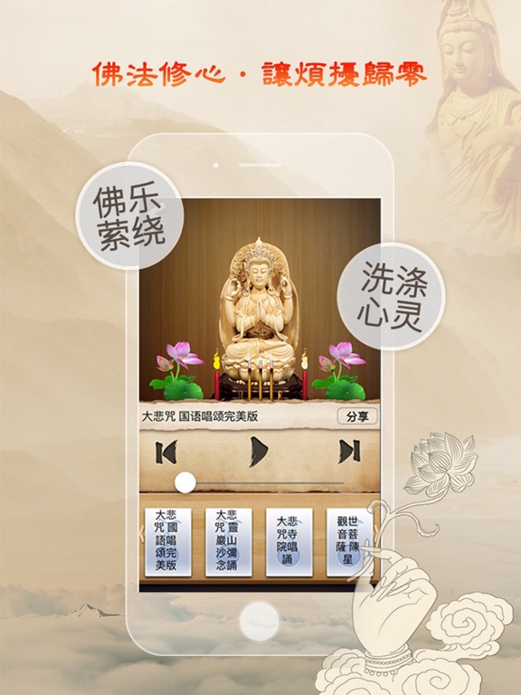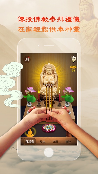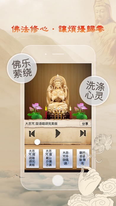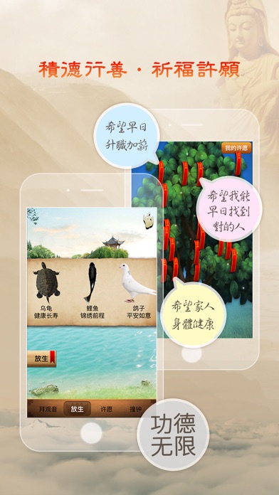 完整版可以聆听50首完整佛乐,免受广告打扰,可保存佛像等更多功能 特色功能介绍: 1、 上万首佛音免费下载 2、 最全的佛经分类,海量经书任您挑选 3、 结缘千万佛友,法师在线开示 4、 佛诞,斋日等提醒,最全的佛历 观世音菩萨是灵动菩提佛教品牌旗下经典参拜观世音菩萨的随身修行应用,通过礼敬和参拜观音菩萨,体验最真实的观音菩萨礼拜,通过聆听观音菩萨心咒,阅读观音菩萨经典,观音灵签指点你的人生,祈福忏悔,净化你的心灵。随喜赞叹,与观音菩萨结缘。 观世音菩萨的六大特点: 1、随身礼拜和供养观世音菩萨,祈愿观音菩萨大慈大悲净化身心灵,一切罪灭尽,百宝从地生。 2、祈福观音菩萨,保佑你心想事成。忏悔过往,往昔所造的一切罪障及失戒定全部得以清净。 3、每日放生,可以积德行善,必能消除业障 4、手机也可以撞钟了,每日撞钟,闻钟声,烦恼轻,智慧长,菩提生,离地狱,出火坑”,帮助我们启智清烦。 5、观音灵签为您指点迷津。 6、诵读佛经, 聆听佛音,学习佛家的智慧,助你静心、定心、悟心、明心。 大慈大悲南无观世音菩萨: 观世音菩萨手执净瓶与杨枝,表示菩萨普救世间的广大悲行。三界火宅,众生心中充满热恼。观世音菩萨能体察众生的苦痛,时以瓶中的甘露水遍洒世间,使在热恼中的一切有情皆获清凉。众生信仰观世音菩萨,即渴求菩萨的甘露水,息灭内心的热恼。佛教劝诫,观世音菩萨确有令众生热恼变清凉的甘露水(甘露又喻佛法涅槃解脱之道),如时时虔诚的礼念观音,能得菩萨的悲心救护。 观世音菩萨具有平等无私的广大悲愿,当众生遇到任何的困难和苦痛, 如能至诚称念观世音菩萨,就会得到菩萨的救护。而且,观世音菩萨最能适应众生的要求,对不同的众生,便现化不同的身相,说不同的法门。在佛教的众多菩萨中,观世音菩萨也最为民间所熟知和信仰。在中国的江、浙、闽、广、台湾,以及南洋华侨间,观音信仰极为普及,所谓“家家阿弥陀,户户观世音”。 因为观音信仰所普遍存在的功利交换心理,佛教认为信仰观音应真心恳切,而不是苦难当头才临时抱佛脚。只有平时忠实真诚,才能和菩萨大悲愿力相应。唯有平时奉行菩萨言教,才能增长清净的功德资粮。好比人在病时信任医师诊治,一旦病好就完全忘却医生嘱咐,这样自然不会有长久健康。不但生病时需要疗养,无病时更需维持和促进健康。信仰观音菩萨,也应在平时忠实奉行。这样才能常得杨枝甘露的灌洒,常得没有热恼的清凉。 官方网址:www.7xiuxing.com 微信公众号:lingdongputi QQ群:306826212Apple 已更新此 App 以显示 Apple Watch App 图标。 1、删除应用中残留的广告 2、修复上香过程的问题 3、适配iOS 11 系统