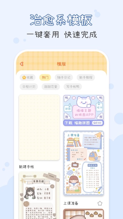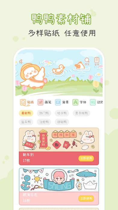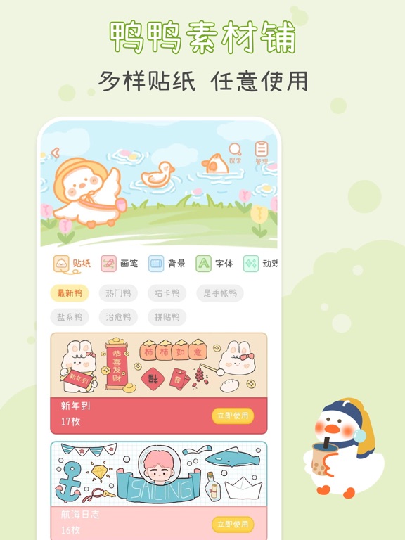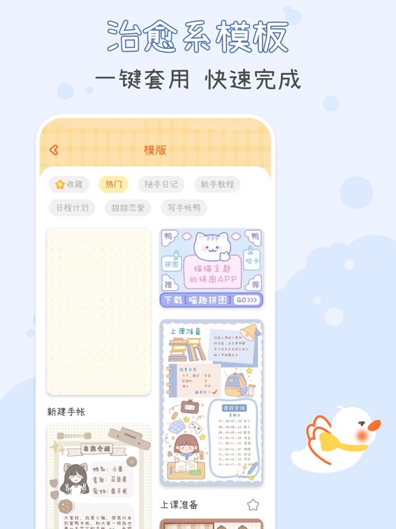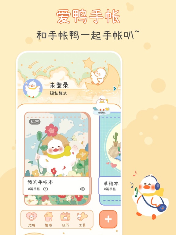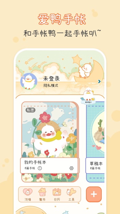 【app介绍】 爱鸭手帐是一款以“手帐鸭”为主题的少女心治愈笔记本。在这里,你可以和鸭鸭酱一起写日记,鸭鸭酱的素材铺有超多免费素材哦~ 未来的每一天,鸭鸭都会与你一起度过,陪你自律打卡、记录心情、吐槽烦恼、记录成长…… 【app特点】 1、爱鸭手帐软件是一款治愈且可爱的软件,超萌可爱的手帐鸭,陪你写手帐。你可以在温馨的氛围中自由的拼贴与记录。 2、操作简单,三部完成一篇手帐。 3、素材广场的素材种类全,样式多。原创新颖的手帐贴纸、背景、画笔持续不断更新。 4、 原创手帐月历功能。月历视图清晰明了,精准查看每一天的日记,不漏任何一天。 5、加密软件锁,为你的每一篇作品保驾护航。 【app使用】 1、在首页界面,点击“+”开始写手帐 2、完成手帐时,可以输入手帐标题和简介,保存在自己创建的手帐本中。 3、在首页左侧展示栏里,可以设计APP密码锁。还可以在日历视图里查看每月手帐打卡情况。 【开发者心愿】 ·嗨,我是刚来到这里半生不熟的手帐鸭,经过两个月的开发,我终于出生啦。初来乍到,鸭鸭既欣喜又紧张,开心我终于来到这里和你们见面;紧张我年幼,深知有很多不足的地方,有很多很多需要提升的空间,但是我会努力优化,不断更新为大家提供更加流畅的体验,更多精美的素材,更多惊喜的功能~ ·你的喜爱,就是我们的动力,哪怕秃头也在所不辞! 如有问题或建议,请加QQ群:781982350,一起交流聊天吧~大家好呀!本次更新主要解决了一些烦人的虫子! 我们非常感谢大家一直以来的支持和喜爱!期待大家在使用爱鸭时更加快乐哦! 嘎嘎~!