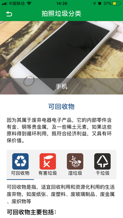 垃圾分类查询App,一款专业垃圾分类查询助手。各种垃圾都能查到,垃圾分类须知常识、助力准确垃圾分类,快速给垃圾找一个合适的家。 ——【核心功能】—— 1,文本输入垃圾名称,快速查询垃圾所属分类。 2,手机拍照,智能识别垃圾所属分类。 2019年7月1日,《上海市生活垃圾管理条例》正式实施,生活垃圾按照“可回收物”、“有害垃圾”、“湿垃圾”、“干垃圾”的分类标准,没有垃圾分类和未指定投放到指定垃圾桶内等会被罚款和行政处罚。垃圾分类查询App,助力智能垃圾分类。 ——【垃圾分类】—— 可回收物:可回收物是指,适宜回收利用和资源化利用的生活废弃物,如废纸张、废塑料、废玻璃制品、废金属、废织物等。 有害垃圾:有害垃圾是指,对人体健康或者自然环境造成直接或潜在危害的废弃物。 湿垃圾:湿垃圾是指,日常生活垃圾产生的容易腐烂的生物质废弃物。 干垃圾:干垃圾是指,除可回收物、有害垃圾、湿垃圾以外的其它生活废弃物。 ——【联系我们】—— 垃圾分类查询App,接入上海发布信息中心,各类垃圾名搜索结果在不断完善中,可能存在部分没有结果的搜索,欢迎广大用户反馈使用问题和给我们建议,我们会努力做最好的垃圾分类查询平台。联系邮箱:app20190304@qq.com