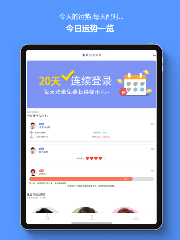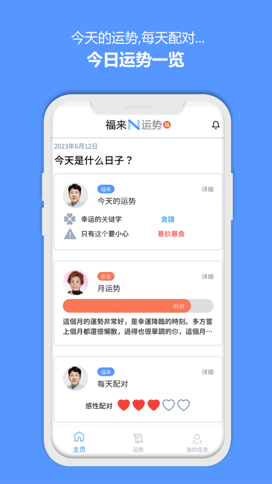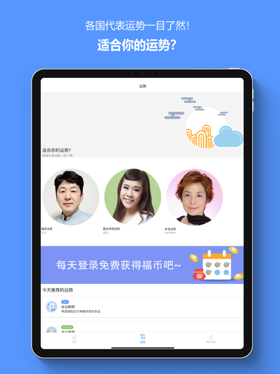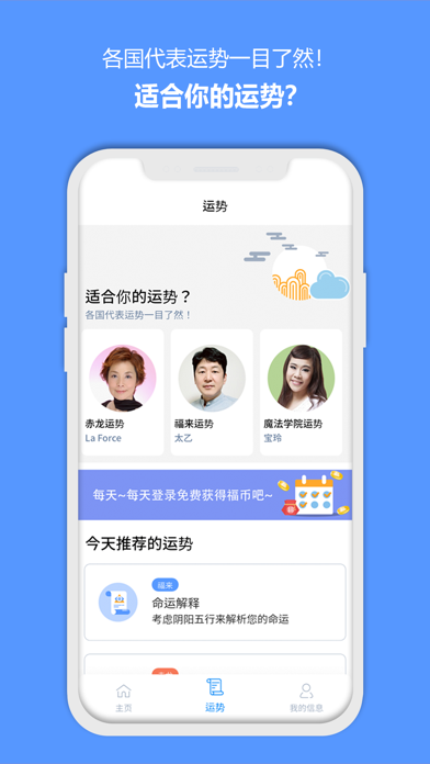 韩国,日本,台湾的著名算命师的算命应用!福来运势! ※ ‘福来运势’由亚洲算命师直接制作数据值得信赖! [福来运势的特征] -丰富多彩的八字解析 1)八字,星座,数秘术, 在各种领域给予详细地说明 2)通过多种多样的图标,看起来更加方便。 3)通过持续的更新带来新的运势解析 -精确的分析 1)拨正了由季节变化的实际太阳时和标准太阳时的均时差。(可以在设置里改变) 2)子时开始算另一天/可以设置从子夜时开始算另一天(可以在设置里改变) 福来运势应用服务 -福来运势 八字命运分析 八字年运势 八字月运势 八字今天的运势 八字明天的运势 八字配对 八字每天的配对 土亭秘诀 乐途 -赤龙运势 数秘术命运分析 数秘术年运势 数秘术月运势 -魔法学院运势 星座命运分析 星座年运势 算命师介绍 台湾-宝灵老师 熱愛神秘學與意識探索。精通塔羅、西洋占星、色彩心理、數字學、靈氣能量、水晶能量、西洋小魔法等等。英國國際色彩應用與藝術科學學院(A SIACT)认证咨询师及执行师,生命数字,萨满能量,倍率愈合扩大疗愈法,西洋占星,阿梵达智者,灵气,水晶能量,光的课程等。 专栏 苹果日报占星塔罗运势色彩占卜专栏 君子君子杂志国际中文版塔罗牌,每月占星运势专栏 美丽佳人杂志每月数字运势专栏 台北沃克每月塔罗色彩专栏 时报周刊塔罗占卜专栏 经历 ‧超视非关命运塔罗色彩专家 ‧东森我爱大小姐塔罗色彩专家 ‧东森女人要有钱塔罗色彩专家 ‧东风卫视开运万事通命理老师 ‧东森综合台开运鉴定团命理老师 ‧时报周刊塔罗牌,灵性彩油,生命数字每周专栏 ‧广州电视台心中有数:色彩心理学老师 ‧85度Ç杂志命理运势专栏 ‧中国大陆的橙色杂志塔罗专栏 ‧女学堂工作室负责人 ‧壹周刊塔罗与色彩占卜 ‧独家报导周刊色彩心理学,生命数字每周专栏 ‧哈波时尚BAZZAR星座专题专栏 ‧科梦波丹时尚占星塔罗专栏 ‧台北电台台北不夜城神秘学单元 ‧GQ杂志,联合晚报专栏 ‧多家企业厂商活动演讲与教育训练等等 ‧多家广播节目线上来宾 现职 ‧作家 ‧宝灵神秘魔法学院 ‧占卜咨询 ‧塔罗与色彩占星课程教学 ‧宝灵星球塔罗 证照及学习 ‧英国国际色彩应用与艺术科学学院(ASIACT)认证咨商师及执行师 ‧生命数字 ‧巫术萨满能量 ‧Magnified愈合扩大疗愈法 ‧西洋占星 ‧阿梵达智者 ‧灵气 ‧水晶能量 ‧光的课程等等 著作 ‧七彩花草开运法 - 邦联文化 ‧2006塔罗占星开运大预言 - 商周出版 ‧幸福魔法36帖 - 布克文化 ‧幸福天使占卜书 - 橘子文化 ‧宝灵心塔罗开启直觉的七十八堂课 - 尖端出版 ‧宝灵心塔罗塔罗能量数字占卜 - 尖端出版 ‧宝灵心塔罗解惑故事牌 - 尖端出版 ‧宝灵心塔罗情感冥想的十道练习题 - 尖端出版 ‧希腊神话占星塔罗(与恩希合着) - 商周出版 韩国-宋錫雄先生 从小就跟祖父学习易学,是一位博学多才的算命师,由于实力出众,曾接受过韩国电视台的访问并得到认证。 并且宋先生曾到武术的发源地郑州学习太极拳,八卦等武艺,是一位文武兼备,有神奇魅力的算命师。 2007年开始在狎鸥亭洞的算命咖啡厅里给无数的人的算命,同时也在编制对现代社会最合适的四柱。 现在他在研究世界的道理。 日本-La Force 经历 2003年 以塔罗牌商谈师成名 在大阪运势沙龙评比中,连续4年占据重复购买率第一位 以La Force 独立后,不仅开展独立商谈,还举办研讨会、互动活动,以及塔罗教室等 TV/杂志报道记录 2005年1月,毎日电视(まいにちほうそう) 报道于‘关西易学家100人’节目 2005年3月,富士电视( フジテレビジョン) 报道于‘你可以一笑而过!’节目 2005年~2007年 在 HanakoWest负责‘明年运势’栏目 2006年1月,毎日电视(まいにちほうそう) 报道于‘关西易学家100人’节目 2006年6月 收录于HanakoWest《心灵治疗师》 2007年2月 JJ收录于《关西地区算得极准的易学家》 2008年 收录于L - magajin 2009年11月 收录于HanakoWest《年末风水专辑》 2009年12月 收录于an - an《年末易学家专辑》 2012年1月 创立自然灾害支援团体“Rafter/Raptor Japan”,并 担任法人代表 2012~2013年 负责日本相互生命保险会社本社、三宫(さんのみや)支店新员工培训 2013年5月 主办爱媛县松山市政府赞助的爱的飘带工程,参演直播脱口秀“出生”稳定性改进更新