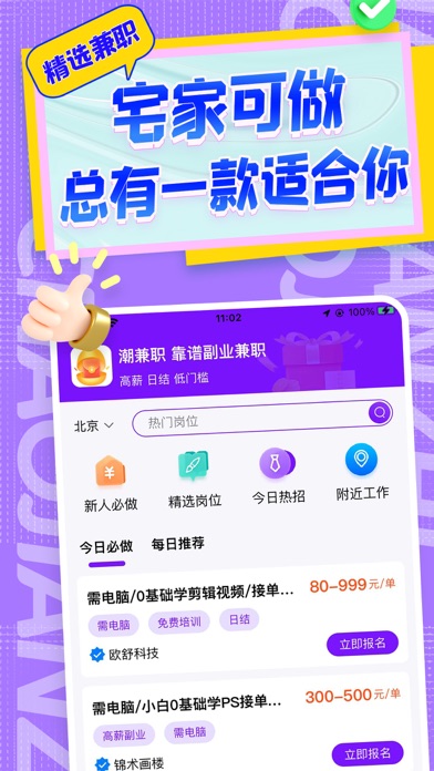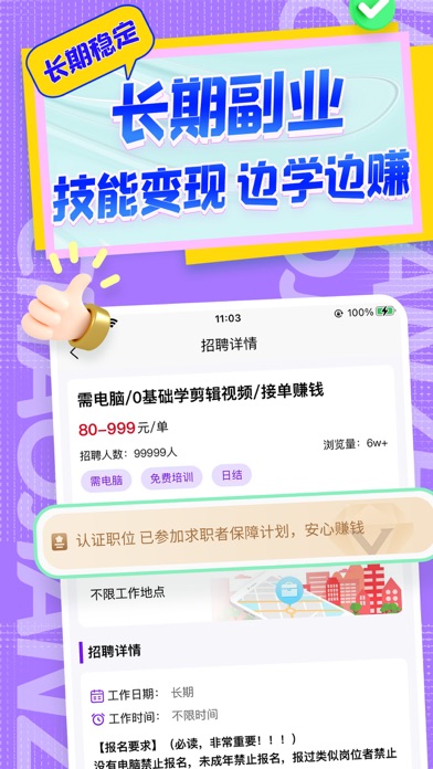 本平台主推:手机兼职,在线兼职,日结兼职,批改作业,视频转发,聊天打字,语音主播,文案编辑,一单一结,手机任务,等等海量岗位无门槛在家可做日结保障。无论是大学生还是宝妈宝爸自由职业者均可。 覆盖7个大类近百种岗位,所有岗位信息5重审核,确保岗位真实、优质,有效。任何发生在平台内的用工纠纷,平台会积极参与解决,全面多效保障用户劳动权益。 【技能副业】 为满足用户长期副业需求,平台联合国内头部机构推出PS修图、PR剪辑、Python编程、JAVA编程、配音播音、插画创作、自媒体运营、等十几种技能副业岗位。0元学习,学成后接单赚钱,长期高收益。目前已成功推荐副业6000+人次,人均月收入达8K。 【精品兼职】 近百种线上线下兼职岗位,100%平台认证审核。让您每次都有不同的兼职体验。无论是补贴零花还是技能提升都会对您充满帮助。 【商家认证】 杜绝虚假!所有在懒人兼职平台发布招聘信息的商家,必须上传营业执照,经平台审核后方可发布兼职。 【兼职认证】 每一个兼职岗位都需要经过审核才可发布到平台,帮你过滤虚假、劣质兼职! 【客服响应】 客服小姐姐7*16小时在线处理您在兼职过程中出现的任何问题,24小时内极速处理。帮您解决所有问题。给您优质的就业体验。更新UI风格,优化报名流程。
