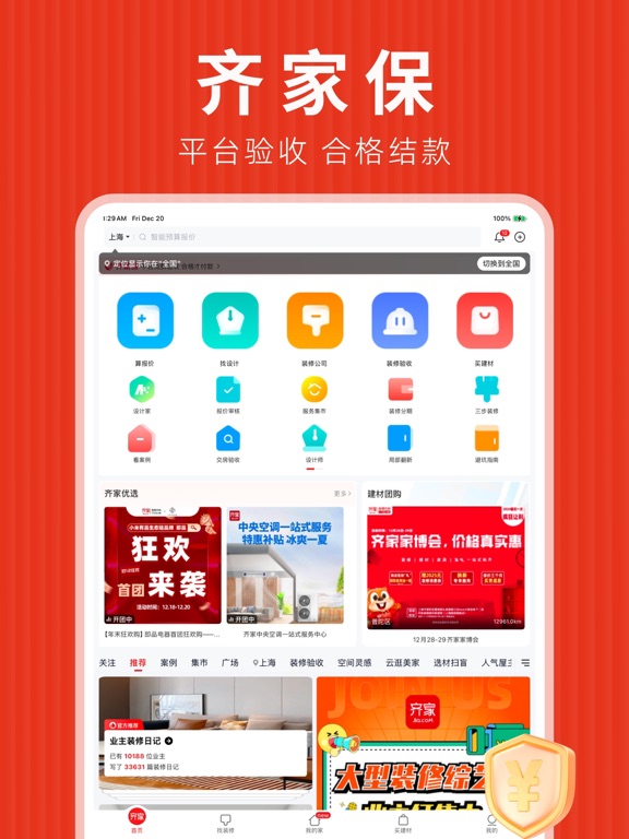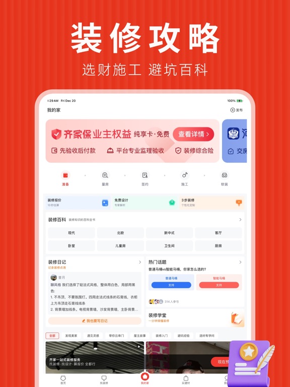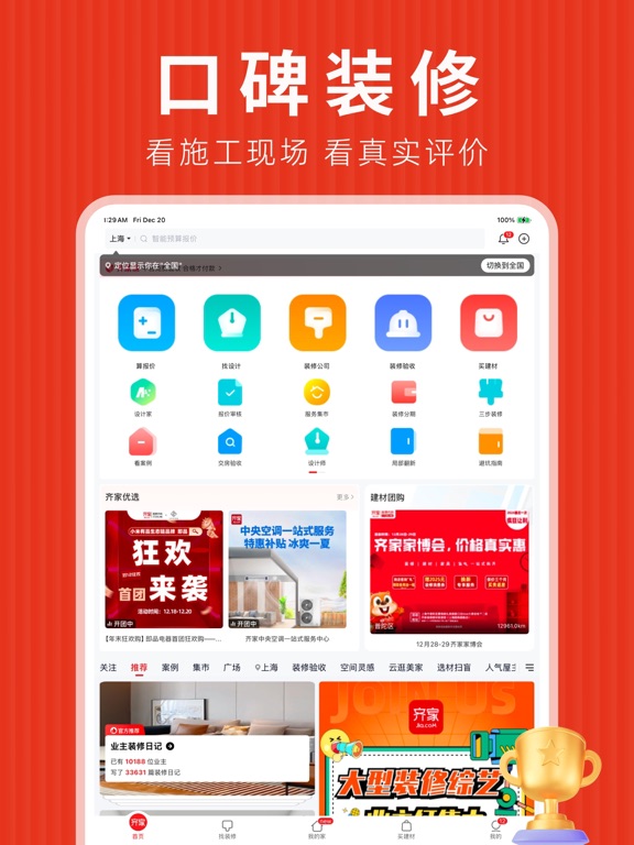 ------装修找齐家,上市大平台----- 陪你打造一个温馨的小窝 海量灵感案例,助你轻松构想未来生活 全程服务保障,陪你省心拥有温馨的家 ------特色功能 服务亮点------ 【收集家的灵感】 万千业主真实装修案例和日记经验分享,在这里找到合适的装修风格,打造温馨家 【设计家的蓝图】 齐家精选本地设计团队,1对1服务量身定制装修风格,多套设计方案总有钟意的那款 【实现家的想象】 平台帮验收、合格再付款,全额担保全程保障,装修的烦恼齐家为您全搞定 【发现家的好物】 超实用、高颜值的建材家居,与齐家一起团购砍价选好物 ------联系我们------ 电话:400-660-7700 公众号:齐家 微博:齐家网 抖音:齐家网装修设计 快手:齐家网装修设计1、优化了一些功能体验 2、修复了一些已知问题
