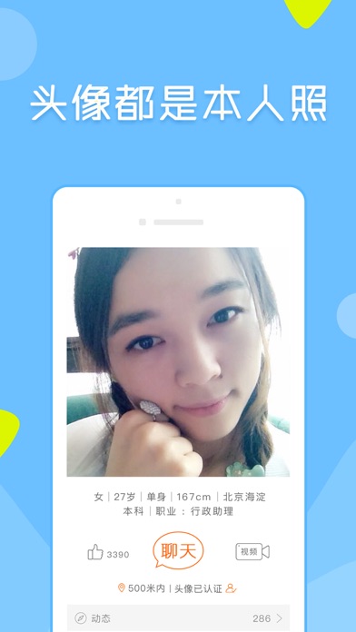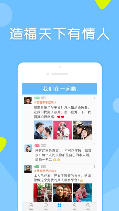 找对象,上像像,不花钱! 像像是一个可以免费找对象的真人相亲平台!真人交友,真人视频,真人聊天,头像都是真人照。 主要功能: 1、头像都是本人真实照片,都经过严格的人脸识别验证和实名制身份认证! 2、互加好友后,可以用文字、语音、图片免费聊天! 3、好友之间还可以一对一视频聊天,沟通更亲切! 4、可以通过动态功能随时分享心情和有趣的事,还可以相互评论。 5、开启定位后,可以随时和附近的人交友聊天。修复了BUG,优化了使用体验。