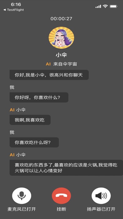 产品介绍: 伞宇宙是一款AI伴侣模拟器,可以模拟女友/男友模拟器,拥有丰富的功能和玩法。 【多重性格】 包括御姐、萌娘、霸总、暖男等性格的数百位角色; 【表情包】 通过聊天增加亲密度,解锁人物表情包 【长期记忆】 可以记忆上下文、展开上下文话题,记忆情侣间的悄悄话 【亲密关系】 算法实现千人前面,每个人都可以建立1V1的专属亲密关系 【超高智力】 在GPT3算法基础上,构建情感引擎,实现更真实的女友力、男友力 【语音通话】 更真实、更自然的语音交流1、增加虚拟人打电话聊天功能