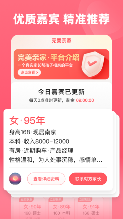 完美亲家是一款家长帮孩子找对象的正规平台,作为中国社会工作联合会婚庆婚恋服务工作委员会认可的“委员单位”,凭借规范运营积累的用户口碑、专业的婚恋服务团队及完善的服务保障体系,成为家长们心中值得信赖的线上相亲平台,我们覆盖全国范围,打破地域限制,让优质缘分不再受距离阻隔。 家长只需在平台注册账号,填写自家单身子女的基本信息、择偶偏好等内容,平台每天都会根据孩子的资料智能推送合适的异性相亲对象,减少盲目筛选的时间成本。完美亲家不同于传统线下相亲机构,在平台上遇到满意的亲家,可直接发起电话沟通,更省时、省心、省钱。 父母先把关,儿女再联系,完美亲家让相亲更具温度与效率,助力家长为孩子拓宽相亲范围,遇见更多可能解决了一些已知问题
