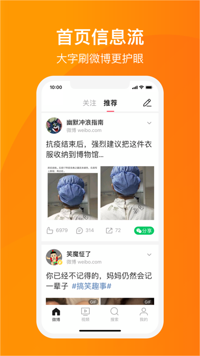 微博大字版,字体放大更护眼,功能简洁易操作,支持辅助工具读屏。打开微博大字版,随时随地发现新鲜事! 【热门微博】 热点内容迅速捕捉,推荐给你感兴趣的内容 【微博视频】 海量高清短视频,新鲜内容极速呈现 【实时热搜榜】 呈现更新鲜的热点事件,想知道正在发生什么,来看热搜榜 【意见反馈】 为打造更好的移动体验,诚心邀请您提出宝贵意见。 意见收集邮箱:support@weico.com 如果您觉得好用,麻烦传播给身边的朋友,或者在Store上给我们打分鼓励~优化细节,修复bug