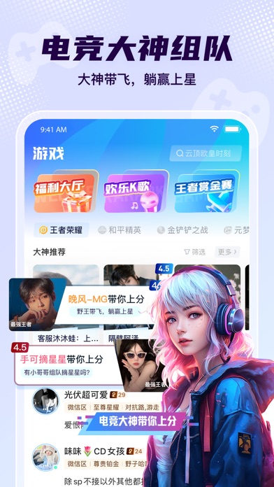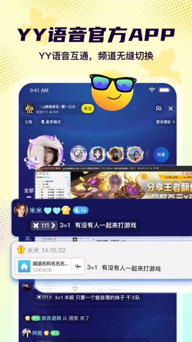 Yo语音,YY官方手游语音APP Yo语音是一款覆盖各类主流游戏娱乐的语音开黑交友app。英雄联盟、王者荣耀、绝地求生、和平精英福利热门游戏全支持,匹配交友给你带来丰富多彩的线上社交体验,让你足不出户就能轻松扩列,找到一起上分的小伙伴~ 【电竞大神】 王者荣耀、和平精英、英雄联盟...主流电竞游戏大神齐聚,各类游戏陪练带你组队上分,随时随地游戏约玩,带你一起享受多人开黑的乐趣 【福利大厅】 每日签到赢取你的游戏专属游戏福利,魔兽世界、绝地求生、幻兽帕鲁福利热门游戏全支持,解锁满分游戏体验,海量福利等你拿~ 【赛事玩法】 丰富的王者赛事组队玩法,畅享多人比赛赢奖励 组队开黑玩王者轻松赢赏金,免费参赛自由提现~ 【热歌抢唱】 一起K歌,欢乐交友 超炸的说唱live,结识更多趣味好友,你的房间你做主 【多人聊天室】 多人语音聊天室扩列交友,群聊派对等功能,随时结识更多陪伴好友处CP,连麦颜值女神,派对狂欢、剧场pia戏、破冰游戏,多种互动玩法等你来体验1.开黑房全新升级,等你来体验! 2.星光相册自动记录送礼高光,一键分享精彩瞬间! 3.修复已知问题,优化用户体验