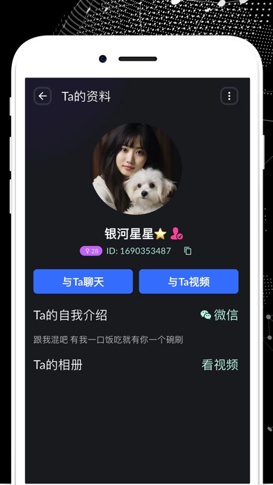 来聊会邂逅同城附近单身异性,来一场别具一格的同城cp体验。 --产品特色-- 在聊会中,每一位真人认证用户均要求使用本人照片,且需要经过系统+人工双重审核才能获取专属标签,确保安全靠谱的社交环境。 可以通过文字交友、语音交友、视频交友等多种方式与附近异性聊天互动,喜欢就撩一下TA,发文字、发图片、发语音,想怎么聊就怎么聊! 海量优质用户+自定义筛选功能+大数据匹配,为您快速找到心动的另一半。 --主要功能-- 语音陪伴,开启缘分之旅! 让耳朵倾听彼此的心声! 同城附近配对,遇见更好的Ta! 一键配对搭讪,搭讪秒速回复! 家族模式,让你找志同道合之友!1修复已知bug