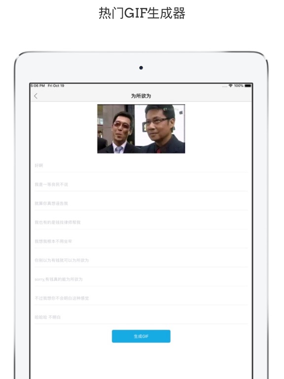 海量最新最热表情包——斗图不再图穷 扣脸自制表情——把朋友P成表情包,快来恶搞吧,超多表情素材,想要把朋友做成什么表情包全由你来创作。 GIF生成器——王境泽真香、为所欲为、张学友旺角卡门、打工是不可能打工啦,渣渣辉五年,谁赞成谁反对,我养你啊等热门GIF生成器,等你来搞笑,更多GIF模板欢迎加入官方群投稿。 欢迎加入我们的斗图群,一言不合就来斗图吧—— 887254585bug fix