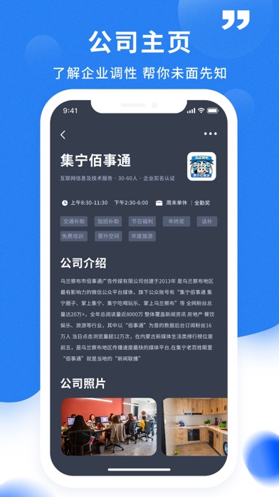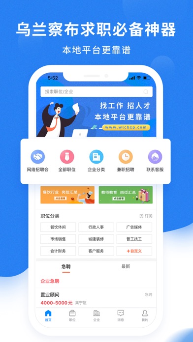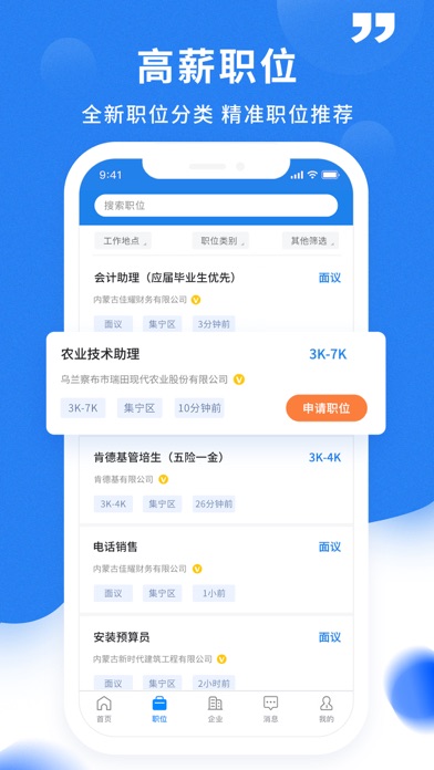 乌兰察布招聘网 本地招聘求职必备APP 海量职位,精准匹配,无论你在哪里,满足人才求职需求 为企业解决招聘难题 我们一直在继续努力,希望每次改变都能让你拥有更好的求职体验,随时欢迎联系我们: 微信公众号:乌兰察布招聘网 官方网站: www.wlcbzp.com1.优化在线聊的稳定性 2.优化用户的体验