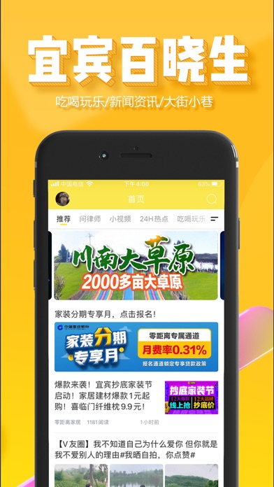 宜宾零距离,同城,同呼吸 “吃喝玩乐、同城交友、优选消费”这个超级app应有尽有 在零距离,你可以城觅同城有品质的吃喝玩乐好店,无论是咖啡、美食、酒吧,还是健身、购物、丽人、玩乐等,这里聚集了这个城市超懂生活的大咖,她们每天会在圈子分享吃喝玩乐好地方,会精选这个城市值得品味的生活方式,会分享她们颜值担当的自拍,你的日子从此被充实,你不再担心今天玩什么,周末去哪儿玩。 在零距离,你可以认识一群生活情趣相投的网络大咖,她们热爱一切美好生活,新潮自拍分享去过的那些好地方,参与同城周边有趣好玩的同城活动,走起城觅新鲜城市生活。 在零距离,你可以掌控城市第一手消息,随时爆料身边大小事,实时分享你的所见所听所感,做本地草根记者,爆料奖拿到手软。总之,你一天不上零距离,就真的不知道宜宾发生什么事。 | 特色功能 | - V友圈:随时随地倾述心情,分享生活点击精彩,比朋友圈更嗨,比陌陌更安全; - 热门话题:优选同城兴趣话题,精准城市社交,邂逅生活情趣品味相投的人,共同交流感兴趣的话题,你还可以创建属于自己的话题; - 生活自拍:新潮自拍秀出你的生活品味,玩到哪自拍到哪,潮自拍、同城旅游、美食攻略统统po上来; - 本地民生:精选本地新闻网事、三江城事,日报掌握当日火爆消息,晚报摆谈情感八卦,生活更惬意; - 吃喝五折:本地吃喝直接五折,打造同城超级吃喝玩乐平台,让吃这件事更简单; - 福利神器:本地生活必备利器,各种福利拿不停,免费看电影、免费同城玩,这一切会让你疯狂; | 特色说明 | 宜宾零距离App是通过聚集本地一群具有生活范的大咖共同探索发现同城吃喝玩乐好地方,并在这里找到这座城市与自己情趣相同的的人。宜宾零距离APP,做独特的地方门户!1、修复了已知BUG 2、提高了系统稳定性