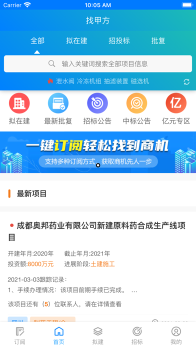 获批、拟在建、招投标工程信息大数据查询! 日均更新项目信息200000条!!!!!包含获批、拟建在建、招标公告、中标信息、招标变更等多维度项目信息。 【产品介绍】 找甲方是由中项永达科技(北京)有限公司研发,找甲方是一家致力于为乙方找到有需求甲方,快速对接甲方对应负责人的资源服务平台。目前已上线国内获批、 招投标前的拟建、在建项目信息,正在进行招标、采购和 中标的信息资源。同步上线项目反查、引荐对接甲方负责人以及协助参与招投标的系列服务。作为国内专业的工程信息网站、动态提供国内各领域项目实际建设的投资数据统计服务商,也是国内可以提供一带一路沿线国家及其他境外国家的全球工程信息资源服务网站。我们以数据的及时性和精准度获得了各领域的国内外知名企业的认可。 【相关行业】 电力行业:水电站、火电、核电站、风力发电、太阳能发电、生物质能发电、余热发电、地热发电、输变电、除尘、水处理、脱硫脱硝、电力配套设施 石油化学工程:石油、石化、煤化工、盐化工、化学纤维、化学原料、化学制品、油墨、化肥、日用化学品、农药、环保及配套设施 制药工程:中间体及原料 药生产、中药生产、化学制药、生物制药、兽用药品、保健药品、卫生材料及医疗用品制造 能源工业:煤炭、煤矿、石油、天然气、输油、输气、天然气站、加油站、油页层、燃料乙醇、生物柴油、生物质能、沼气、燃料电池、风力发电、太阳能发电、地热、充电桩、能源其他 机械电子电器:机械、模具、船舶、电子电器 轻工纺织食品:造纸、印刷包装、纺织、服装皮革、塑料制品、烟草、食品、屠宰、饮料、饲料、家具、工艺品 治金矿产:治金、金属制品、煤矿、非金属矿物、黑色金属矿、有色金属矿 环保:污水处理、污泥处理、废气处理、固体废弃物、环境综合治理 市政:给水工程、给排水、排水工程、城市管网、泵站、集中供热、管廊、市政交通、城市园林绿化、市政配套设施 建材:玻璃、管材、水泥、混凝土、砖瓦板材、耐火材料、涂料、陶瓷材料 交通设施:高速公路、普通公路、城市道路、轨道交通、机场、车站、航道、港口码头、桥梁、隧道、服务区、绿化、收费站、停车场 仓储物流:物流基地、保温仓库、普通仓库、其他特种仓库 建筑房地产:厂房、生产基地、园区建设、公共配套设施、停车场、酒店、实验室、楼宇 农林水利:养殖、种植、畜牧、农副产品加工、水库、河道整理、防洪、引水灌溉、农田 园林景区绿化:公园、生态园、文化旅游、景区、绿化、湿地 新基建:特高压、5G建设、大数据、人工智能、工业互联网、城际高铁、城市轨道、充电桩 【联系我们】 微信公众号:找甲方 客服电话:15321425487 投诉建议:1707108486@qq.com 官方网站:www.zjiaf.com更新部分界面显示,增加企业库功能,修复已知bug