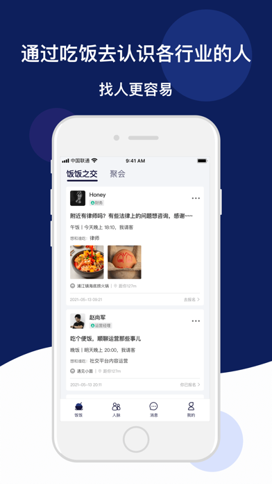 饭饭之交,一款专注于职场人群通过约吃饭来认识好友,沟通交流,拓展人脉的商务软件。 这个世界上没有什么是一顿饭不能解决的事儿~~~ 如果有,那就两顿~~~ 中国素来有“民以食为天”的经典。在国外,也有股神巴菲特3000W来拍卖午餐… 吃饭是一个我们每天都在做的事情,同时吃饭也可以帮助我们解决很多问题。 无论是职场中平凡的我们,还是行业大咖们,其实都想获得和更厉害的人沟通交流的机会。但是如何认识更厉害的人,并且获得回复是一件困难的事。 在饭饭之交,无论你想认识什么人,这一切都不过一顿饭的事儿!!! 律师、顾问、职业经理人、CTO、CIO、设计师、研发、运营、赛车手… 你可以在这里找到各行各业厉害的大佬,通过邀请吃饭去认识他们,向你分享经验,帮你解决各种问题。 ——在饭饭之交: - 你可以申请参加行业大咖们的饭局,获得吃饭交流的机会,通过吃饭这种近距离的社交,一对一的交流和相互倾听,获得突破性的成长; - 你可以通过约大咖们吃饭用来拓展人脉,认识身边的大咖们,分享观点,碰撞思想的火花; - 你可以邀请高手组局吃饭,拓宽认知边界,邂逅你的专属机遇,收获更多干货; ——你也可以自己发布饭局,基于饭饭之交的就近位置: 寻找和你同一个工作园区和你同职业的有缘人; 寻找和你同一栋楼可以和你交流行业经验的小伙伴; 每个人都可以在这里遇到和自己口味相同,又气味相投的人。 从此,找人更容易,找人不费事。 产品特色: 【饭局交友】通过组局吃饭认识更多行业大咖们,搭建自己的优质人脉网络; 【人脉拓展】通过职业认证,可让你与不同行业不同公司的人友好交流互助,更容易拓展自己的职场人脉; 【专属title】无论你是CEO,赛车手还是跆拳道高手,都可以认证自己的专属title,彰显个性自己,并认识更多有相同兴趣爱好的人; 【实名认证】所有用户资料真实性都经过平台重重审核,确保真实性,保障每一位用户的权益。新版本 添加全新聚会饭局模式,可以和更多志同道合的人一起聚餐吃饭啦!!!