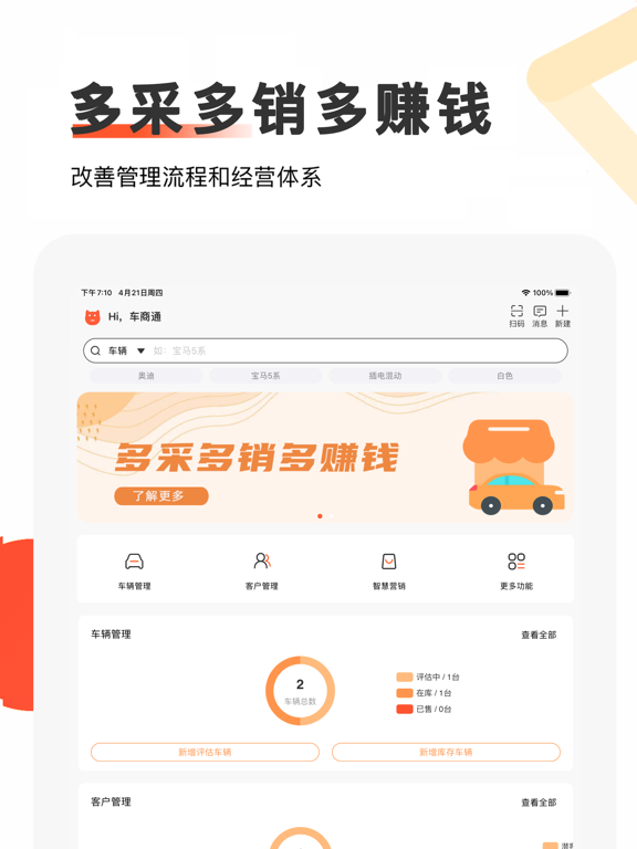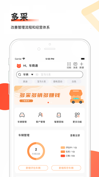 车商通是丰车公司推出的面向二手车商的智慧进销存系统。 --------【车商通品牌形象】-------- 品牌卡通形象:招财猫。象征着:勤劳,智慧,勇敢,简单,踏实,稳健、乐于合作、有担当,豁达进取,受人尊敬。 我们期望通过招财猫的品牌形象,来改变消费者对二手车行业和经营者的固有偏见,让二手车行业20万经营商家和60万从业者,成为受人尊敬的群体。 --------【智慧进销存系统】-------- 我们以智慧数字技术为核心,结合多年深耕二手车行业的经验,以帮助二手车经营企业“多采-多销-多赚钱”的“三多”为目标, 改变过去“缺管理流程和经营体系、缺采购和营销渠道、缺持续化盈利能力”的“三缺”局面,通过创新的人工智能和大数据技术,通过车商通产品,赋能门店经营管理端和业务端,通过数字化、过程化、体系化,帮助二手车经营实现多采-多销-多赚钱的目标! --------【与丰车一起共建】-------- 丰车是世界五百强和知名互联网上市公司投资的产业互联网服务商,深耕二手车产业超过8年时间,服务二手车产业上下游企业,合作了超过25家汽车厂商,80多家4S集团和近3万家经销商和车商门店。 --------【联系我们】-------- 我们的改进离不开您的反馈与建议,有疑问随时联系我们。亲爱的用户您好!车商通2.0版本上线啦!o( ^ _ ^ )o~ 本次更新内容: - 提升页面的显示兼容性,优化新设备操作体验。 - 包含稳定性及性能提升,并修复一些已知问题。 为了获得更好的用户体验,车商通会定期更新应用,每次应用的更新都包含性能和稳定性提升。 非常感谢大家对车商通使用后提出的反馈建议,我们会逐步在车商通中优化调整,同时感谢大家对车商通的支持,我们会更加努力,为您带来更好的体验!