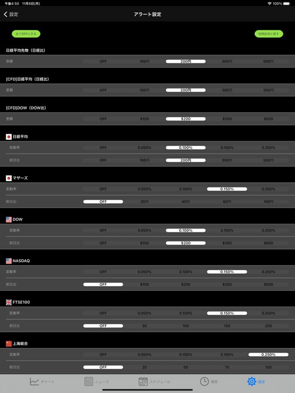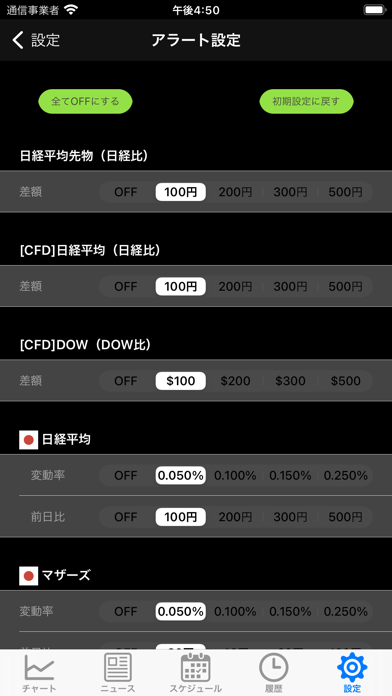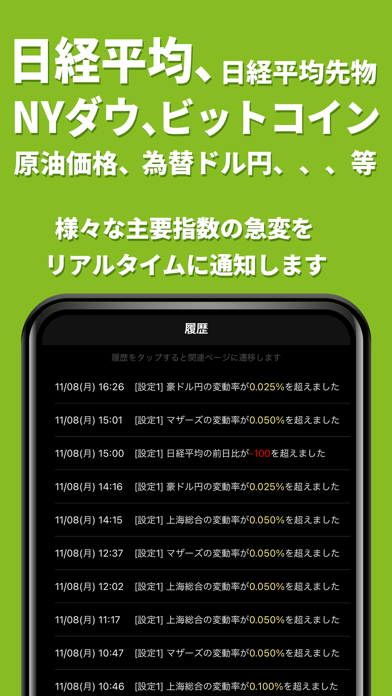 頻繁な相場チェックが不要になる!世界の株価の暴落や急騰をプッシュ通知するアプリです! 無料でリアルタイムに日経平均株価、日経平均先物、NYダウ、為替ドル円、原油価格、仮想通貨ビットコイン等の重要指数を確認することが出来、大きな変動が発生した時にはプッシュ通知でお知らせします。 このアプリをインストールしておけば「海外の相場の急変に気付かかった( ノД`)」なんてことが激減します。 ・日経平均株価の前日比100円で設定をすると 前日比が・・・-300円 -200円 -100円 +100円 +200円 +300円 ・・・を超えた時に通知をします。 ・大きな変動だけアラームが欲しい場合には設定画面で前日比200円に変更すれば 前日比が・・・-400円 -200円 +200円 +400円・・・を超えた時に通知をします。 為替ドル円の場合には直近10分間での変動率を通知し、相場の急変をいち早く察知することが出来ます。 ※アプリをインストールする際に必ず通知設定を許可するようにして下さい。 ■アラート対応指数 ・日経平均先物・日経平均株価・NYダウ・NASDAQ・FTSE100・上海総合・米国債10年利回り・ドル円・ユーロ円・ユーロドル・豪ドル円・ポンド円・WTI原油先物・金先物・ビットコイン円・イーサリアム円・VIX恐怖指数・日経平均CFD・NYダウCFD 2.5.1 ・設定画面のスマホ版に、旧スマホ版表示への切り替えを追加しました。 2.5.0 ・ランドスケープモード時の画面サイズを修正しました。 2.4.9 ・軽微な修正 2.4.8 ・チャートタブでSlideOver時メニューバーが表示されないことがあったのを修正 2.4.7 ・ユーロ円の変動率の初期設定と低頻度設定をOFFに変更しました ・その他軽微な修正 2.4.6 ・メニューバーの表示を修正しました。 2.4.5 ・ダークモード時のタブバーの表示を修正しました。 ・その他軽微な修正 2.4.4 ・経済指標アラームの設定をアラート設定に移動しました。 ・経済指標アラームの重要度が5段階に変更になりました。 ・米国債10年利回り、WTI原油先物、金先物、ビットコイン円、イーサリアム円の通知される変動率を変更しました。 ・その他軽微な修正 2.4.3 ・変動率%の通知と設定に表示上の誤りがありました。 実際の変動率の1/4の表示となっていた為、 正しい4倍の数値に変更しました。 表示上の修正であり通知頻度は今までと変わりません。 ・その他軽微な修正 2.4.2 ・履歴画面の動作を改善しました 2.4.1 ・NASDAQ、マザーズの変動率の初期設定と低頻度設定1をそれぞれ0.150%->0.250%、0.250%->OFFに変更しました ・履歴画面の動作を改善しました ・設定画面にバージョン履歴の追加しました ・iPad版不具合の修正 2.4.0 ・アラート設定の通知頻度設定タイプを追加 ・その他軽微な修正 2.3.0 ・変動率の+ー表示に対応しました。 ・履歴画面の表示を改善しました。 ・その他軽微な修正 2.2.0 ・日経CFD(日経比)、NYダウCFD(DOW比)、マザーズ、NASDAQ、米国債10年利回、金先物、イーサリアム円、豪ドル円、ポンド円、のプッシュ通知追加 ・その他軽微な修正 2.1.1 ・マルチタスク対応 ・ニュース欄のリンク不具合修正しました ・その他軽微な修正 2.1.0 ・履歴画面、通知からチャートページと経済指標ページへの遷移追加 ・通知に設定しているレベルを追加 ・履歴画面に経済指標の履歴を追加 ・その他軽微な修正 2.0.0 ・日経平均先物、VIX恐怖指数、ユーロ円、ユーロドルのアラート通知に対応しました。 ・アラート設定を3段階から4段階に増やしました。 ・横向きでフルスクリーンチャートを表示するランドスケープモードを追加しました。 ・チャート表示にPC版(nikkei225jp.com)表示を追加しました ・アラート通知の登録処理修正